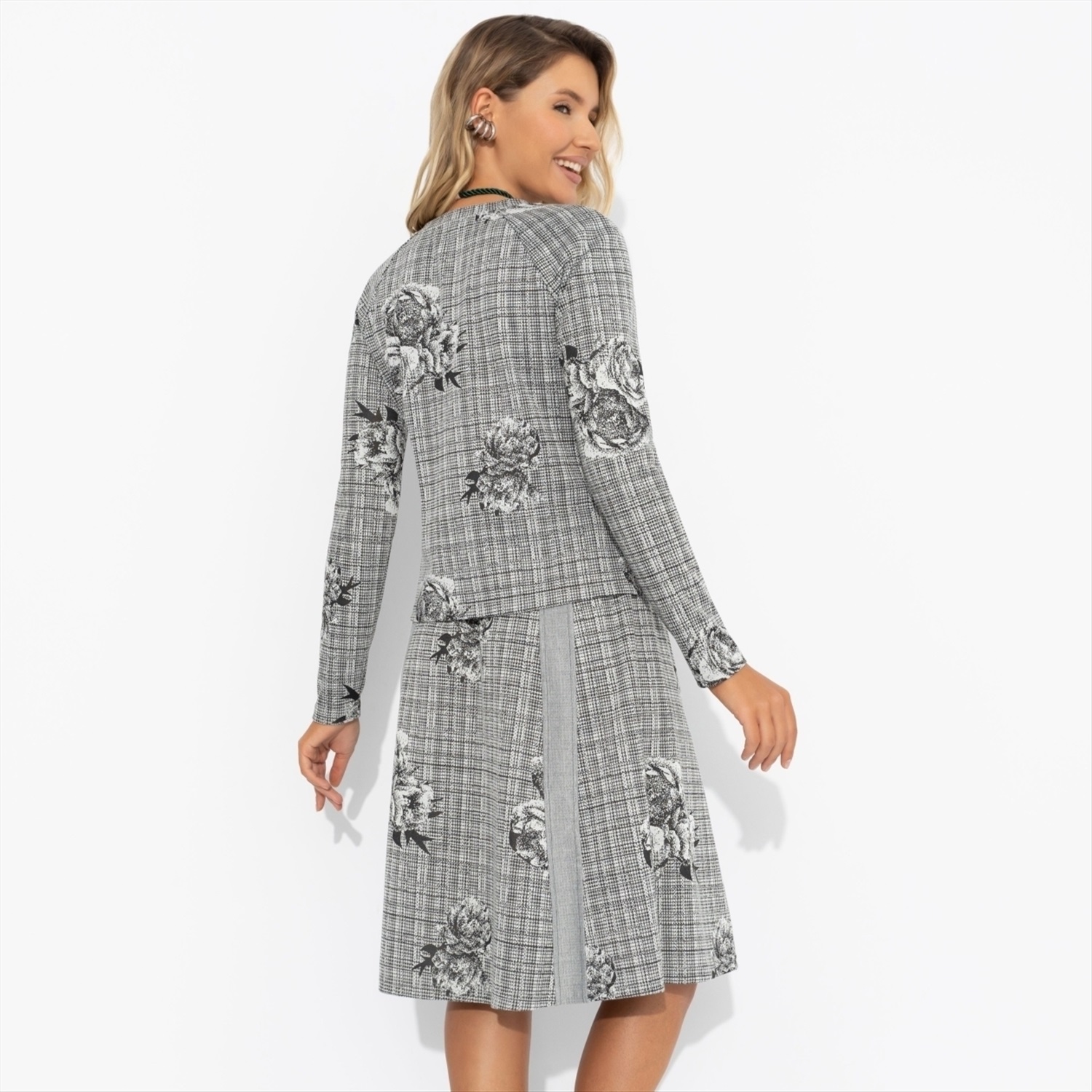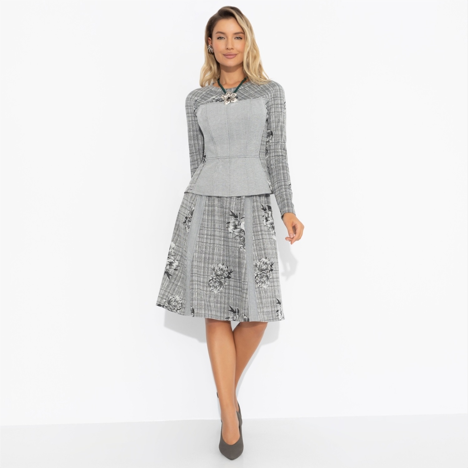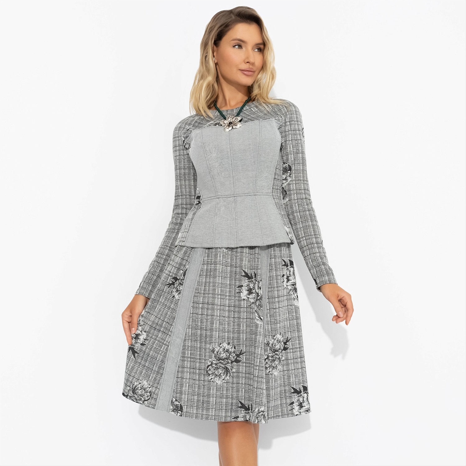 Баланс элегантности и скромности, который оценят его мама и бабушка. Дополни образ лаконичными аксессуарами — жемчужными серьгами, чтобы окончательно влюбить в себя его родственников и заодно подчеркнуть свой хороший вкус. Ты женщина, которая ценит классику, семейные традиции и теплоту в общении. Комплект состоит из приталенного верха и юбки в длине до колена. Юбка чуть расклешенная. Комбинация двух типов ткани. Рисунок на блузе имитирует корсет по передней стороне изделия. Пояс юбки на резинке.