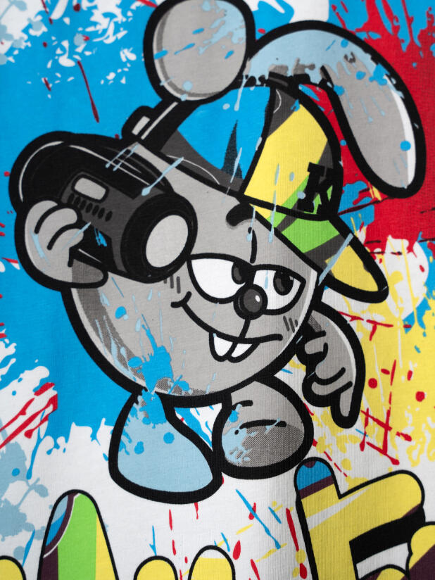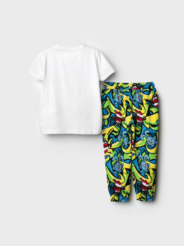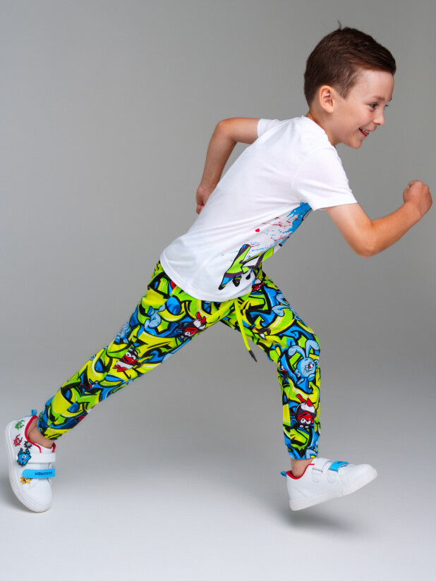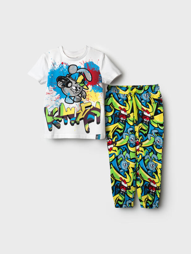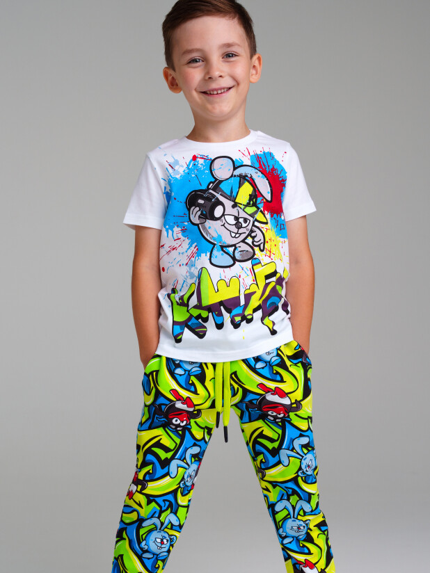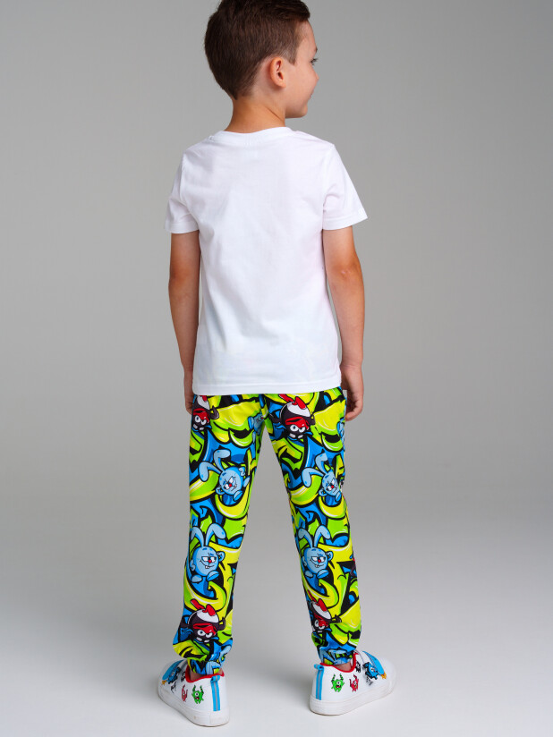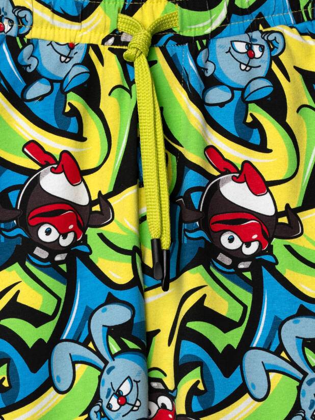 Комплект "Смешарики": футболка и брюки. Выполнен из эластичного и приятного на ощупь трикотажа. Брюки с карманами в боковых швах. Эластичный пояс со шнурком. Эластичные манжеты по низу брючин. Высокое содержание хлопка 95%. Благодаря наличию эластана в составе ткани изделие держит форму и меньше мнется.