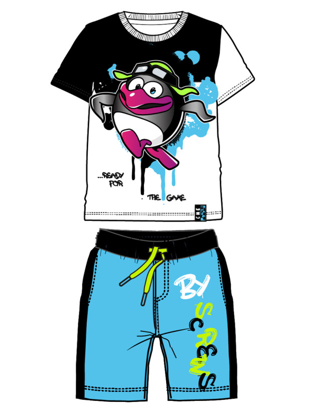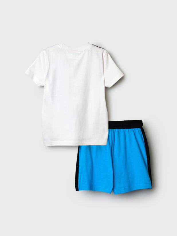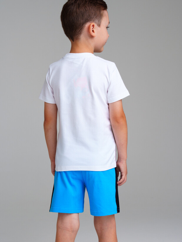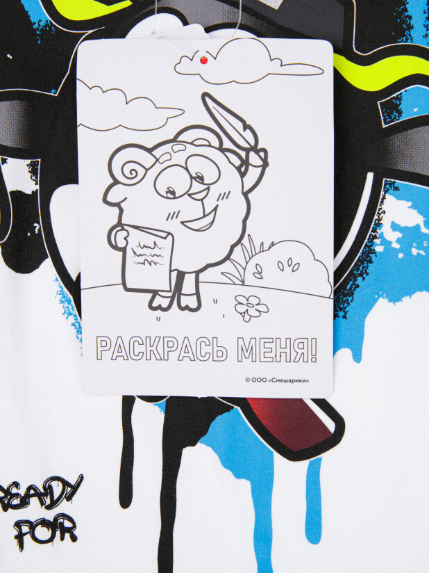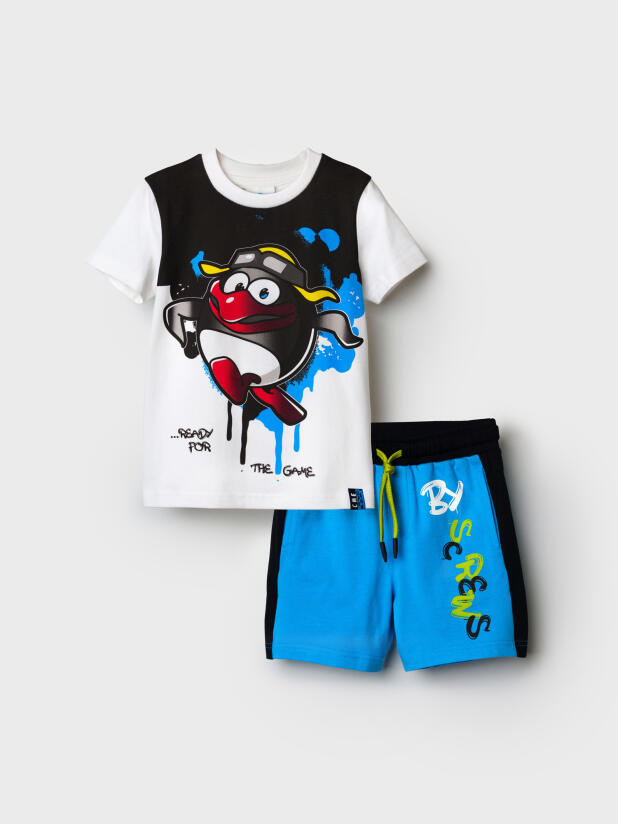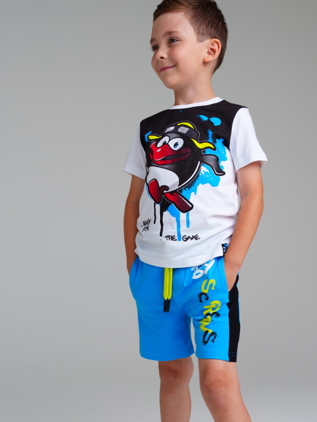 Комплект "Смешарики": футболка и шорты из эластичного и приятного на ощупь трикотажа. На шортах эластичный пояс со шнурком. Высокое содержание хлопка 95%. Благодаря наличию эластана в составе ткани изделие держит форму и меньше мнется.