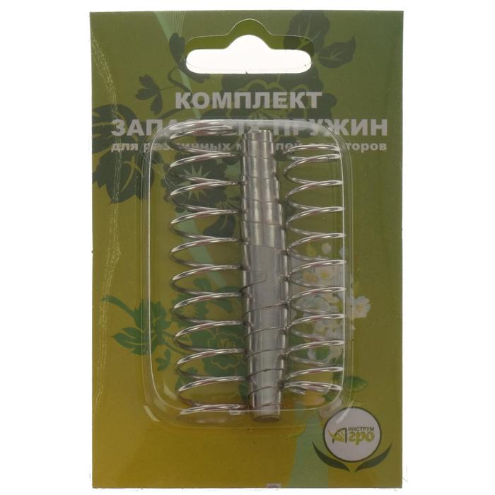 Габариты: 10,5 x 7 x 2; Страна: Китай; В боксе: 480 шт; Состав: Металл; Материалы: металл; Фасовка: по 1 шт; Индивидуальная упаковка: Блистер; Сертификат: Не подлежит сертификации; Материал: Металл; Вид: Комплектующие; Тип пружины: Спиральная, Ленточная В наборе 2 витых пружины разной длины (6,3 × 1,4 см и 5 × 1 см) и 1 ленточная (d = 0,5- 1 см, L = 6 см). Материал: сталь. Подходит к различным моделям секаторов.