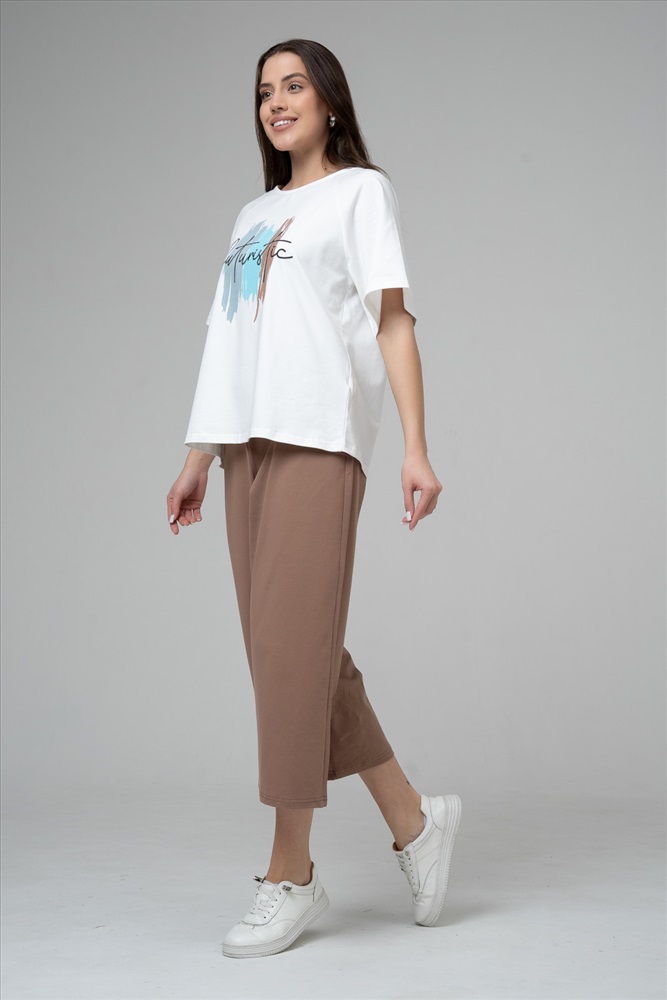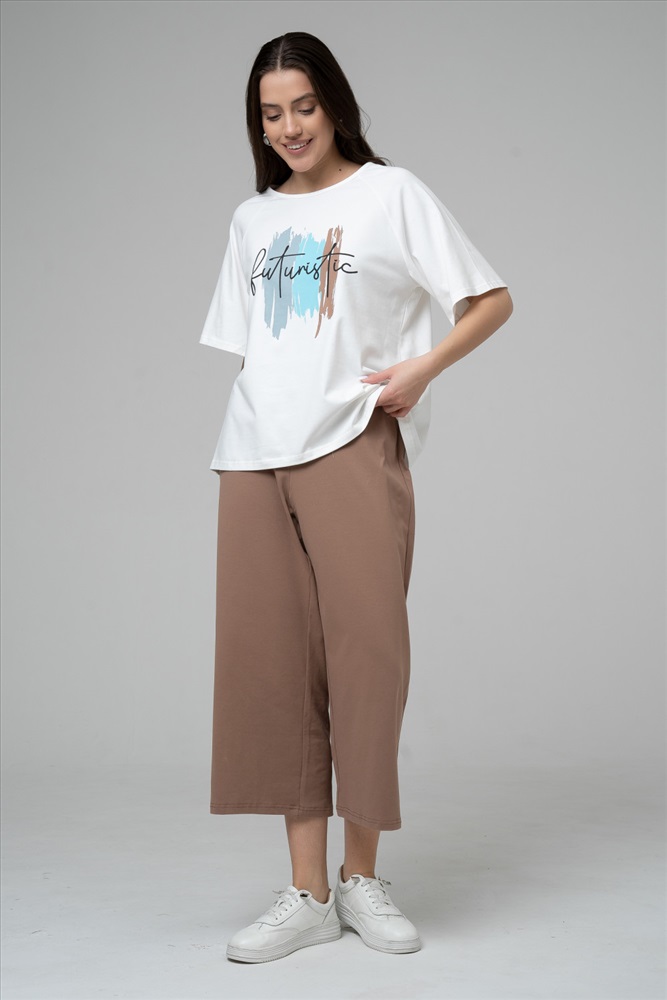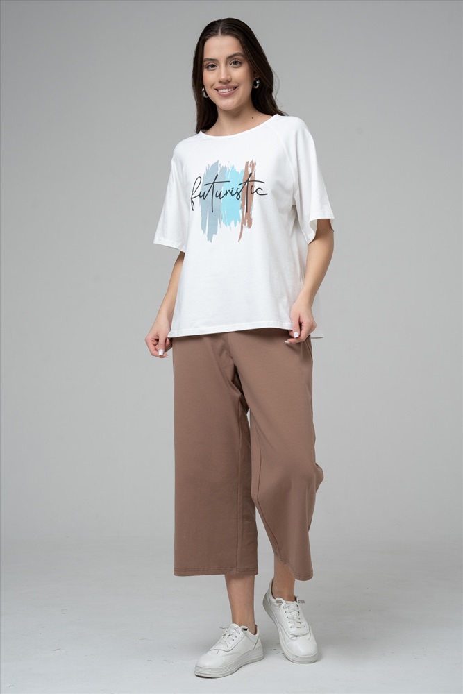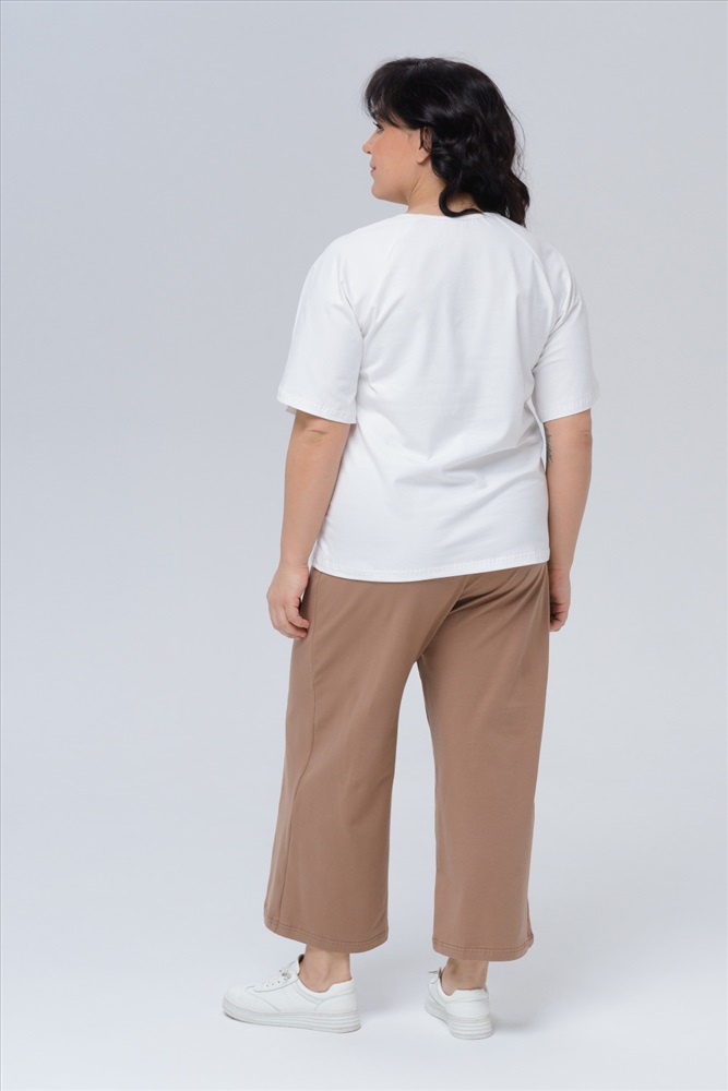 Идеальный пижамный комплект для сна и домашнего отдыха выполнен из высококачественного гипоаллергенного материала — натурального хлопка с лайкрой. Футболка полуприлегающего силуэта с рукавами реглан, а брюки чуть свободные, длиной ниже колена не сковывают движения и обеспечивают максимальный комфорт во время носки. Натуральный хлопок в составе материала комплекта приятно прилегает к телу и дарит ощущение абсолютного комфорта.