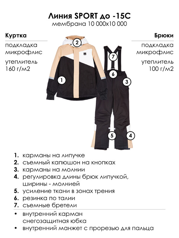 Верх: 100% полиэстер Мембранное покрытие 10 000*10 000 Подкладка: микрофлис 100% полиэстер Утеплитель: куртка 160 г/м2, брюки 100 г/м2