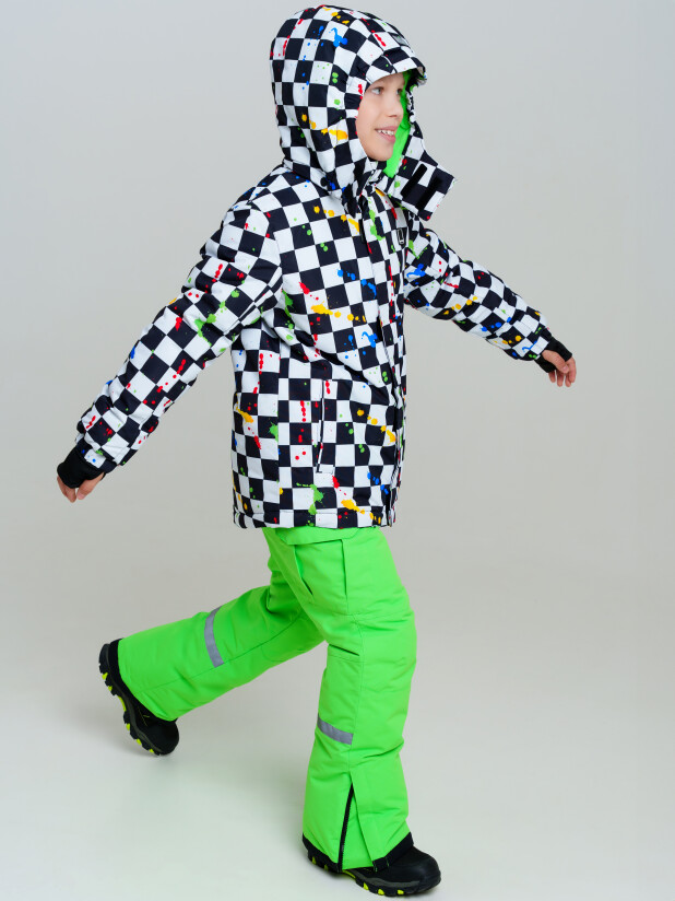Мембранный материал делает этот яркий и модный комбинезон непромокаемым: мембрана не пропускает влагу снаружи, но выводит её изнутри, что крайне важно во время подвижных игр и занятий спортом.
