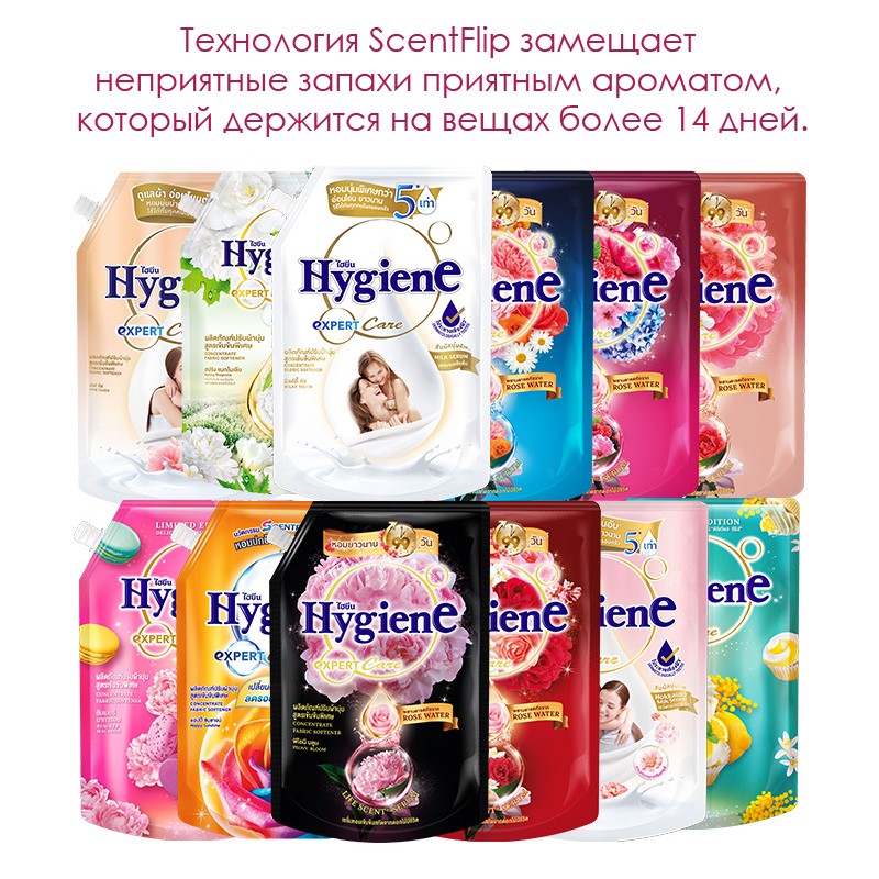 Концентрированный кондиционер для ручной и машинной стирки тайского производства, изготовлен на основе собственной инновационной запатентованной технологии Nature Booster. Технология удерживает аромат в волокнах ткани в 5 раз дольше обычного, а инкапсулированная арома-эссенция, созданная из 100% натуральных компонентов, окутывает вещи благоуханием природной свежести. При создании кондиционера для белья Hygiene использовали инновационную запатентованную технологию: технология ScentFlip – она замещает неприятные запахи приятным ароматом, который держится на вещах более 14 дней. Способ применения: