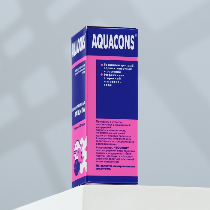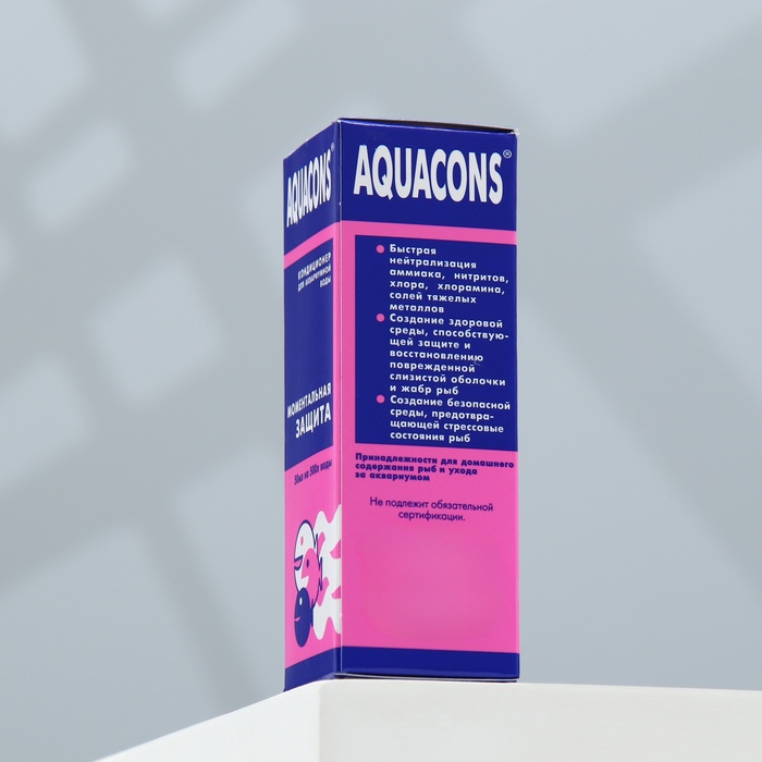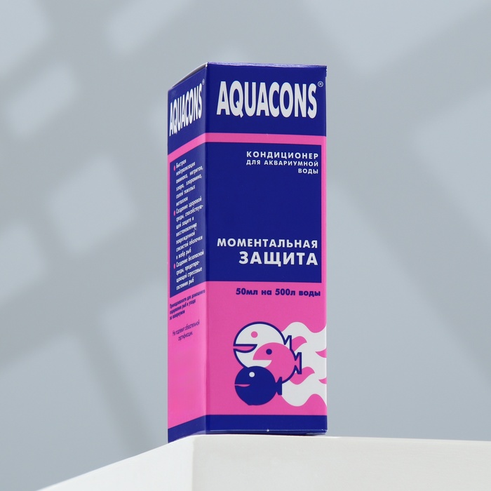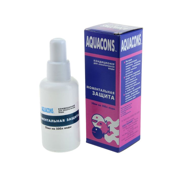 Производитель: Зоомир; Габариты: 10,5 x 3,5 x 3,5; Страна: Россия; В боксе: 80 шт; Состав: См. на упаковке; Материалы: см. на упаковке; Фасовка: по 1 шт; Индивидуальная упаковка: Цветная картонная коробка; Сертификат: Не подлежит сертификации; Вид: Кондиционеры; Темпер. ограничение НЕ НИЖЕ ℃: +1; Темпер. ограничение НЕ ВЫШЕ ℃: +30 Кондиционер «Акваконс моментальная защита» для аквариумной воды 50 мл предназначен для нейтрализации аммиака, хлора, хлорамина и солей тяжелых металлов в морской и пресной аквариумной воде, что предотвращает отравление рыб, вызываемых этими вредными веществами. Также этот кондиционер способствует защите и восстановлению повреждений слизистой оболочки и жабр рыб, предупреждает и защищает рыб от различных стрессов, в том числе возникающих в процессе их транспортировки.  Рекомендуется применять для карантинных аквариумов с новоприобретёнными рыбками. Способ применения:  Определить наличие в аквариумной воде вредных веществ визуально по самочувствию рыб или с использованием специального тест-индикатора (не прилагаются).  Кондиционер вносят в аквариум из расчёта 5 мл на каждые 50 л аквариумной воды.  После внесения средства воду в аквариуме следует аккуратно перемешать. В рекомендуемом количестве кондиционер безопасен для рыб и аквариумных растений. Допускается пятикратное превышение указанной дозы в аквариумах без растений.