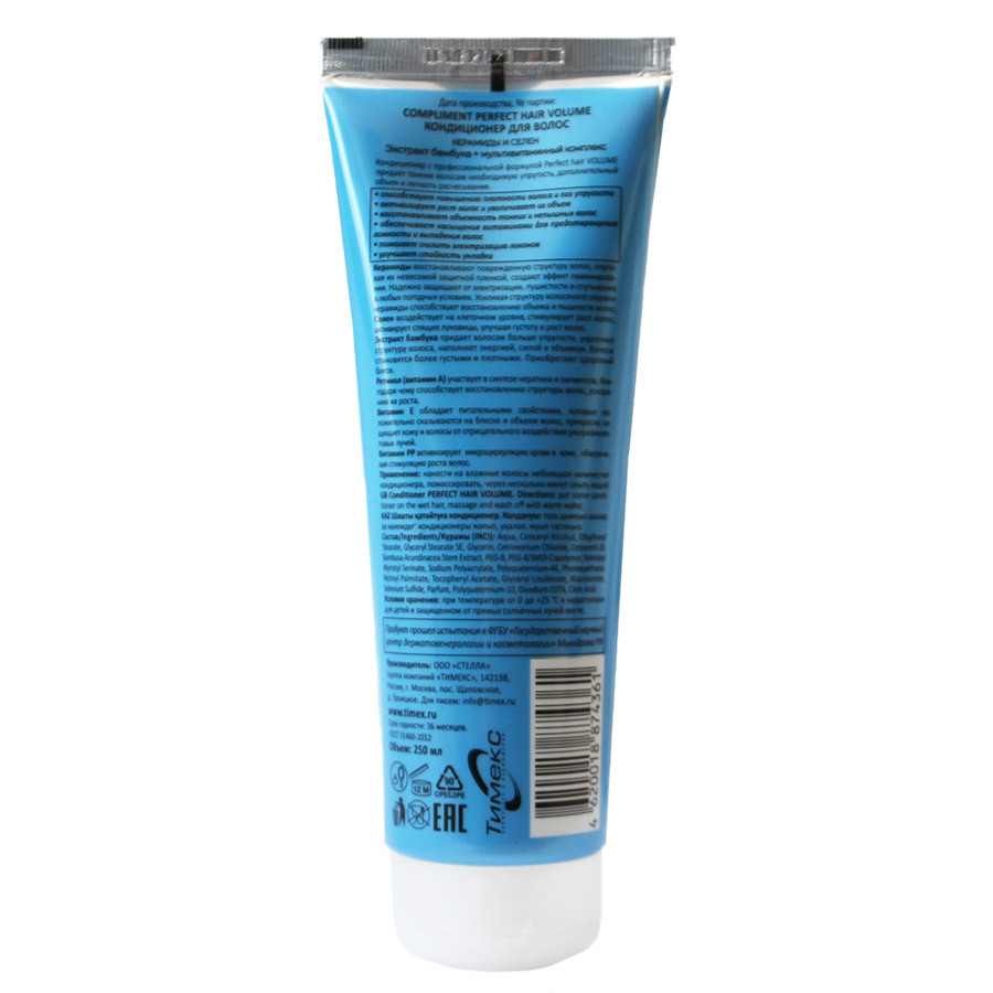 Оригинальность: Оригинал; Объем, мл: 250; Страна производитель, на упаковке: Россия Все описание Кондиционер для волос Compliment Perfect Hair Volume Керамиды и селен, экстракт бамбука + мультивитаминный комплекс 250 ml