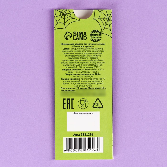 Производитель: Фабрика счастья; Габариты: 0,4 x 4,5 x 11,5; Страна: Россия; В боксе: 1000 шт; Состав: См. на упаковке; Материалы: см. на упаковке; Фасовка: по 1 шт; Сертификат: ЕАС; Вес нетто, г: 10; Вид упаковки: Коробка картонная; Тематика праздника: Хэллоуин; Вкус: Ассорти; Вид: Жевательные