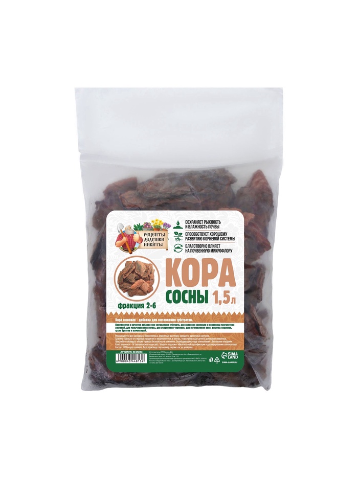 Кора сосны "Рецепты Дедушки Никиты" может использоваться как субстрат для выращивания растений в горшках, контейнерах или грунте, а также как мульча для укрытия почвы в саду или огороде. В обоих случаях она помогает сохранить оптимальные условия для роста растений, защищая корни от перегрева, переохлаждения и пересыхания. Кроме того, кора сосны предотвращает развитие сорняков, что уменьшает необходимость вручную пропалывать грядки.