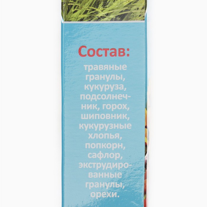 Состав: травяные гранулы, кукуруза, подсолнечник, горох, шиповник, кукурузные хлопья, попкорн, сафлор, экструдированные гранулы, орехи.