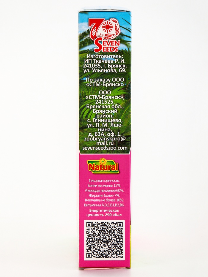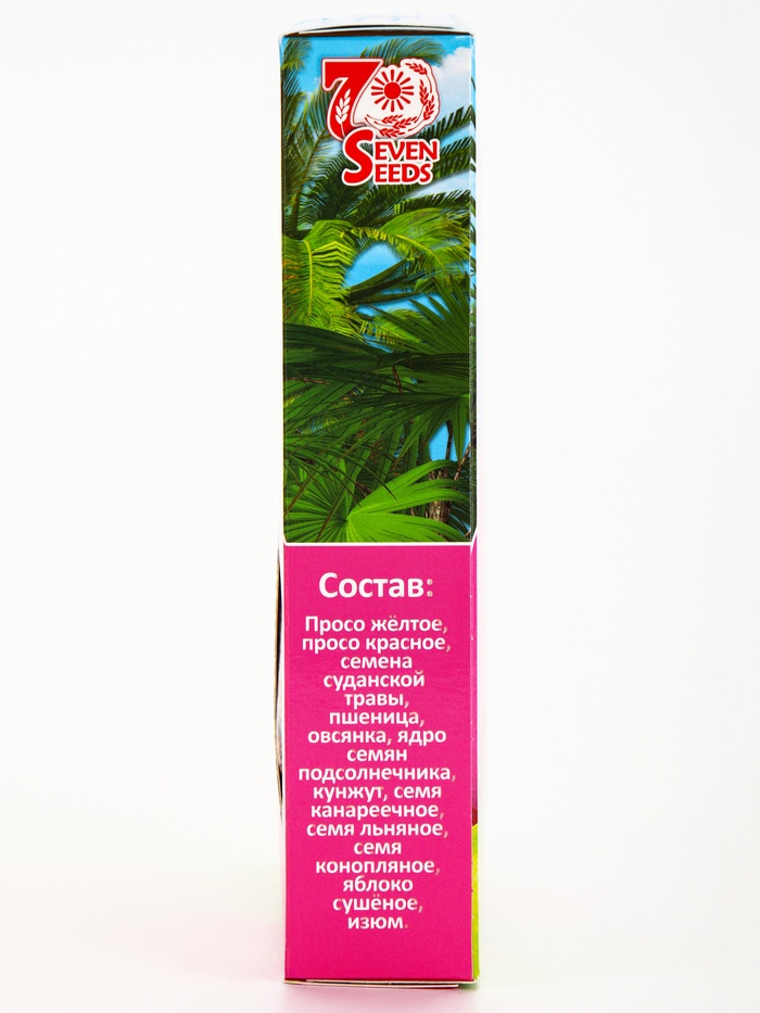 Производитель: Seven Seeds; Габариты: 18,7 x 13,3 x 3,5; Страна: Россия; В боксе: 12 шт; Состав: Семена, злаки, фрукты; Материалы: семена, злаки, фрукты; Фасовка: по 1 шт; Индивидуальная упаковка: Картонная коробка; Сертификат: СТР; Особенности корма: Основной; Назначение: Для волнистых попугаев; Вид: Смесь; Темпер. ограничение НЕ НИЖЕ ℃: +1; Темпер. ограничение НЕ ВЫШЕ ℃: +30; Меркурий: Да В состав корма входит минеральный комплекс. Все это будет способствовать более быстрой смене оперения и яркой окраске. Следите за наличием воды в поилке. Состав: просо жёлтое, просо красное, льняное семя, канареечное семя, конопляное семя, кунжут, овсянка, пшеница, подсолнечник (очищенный), суданка, фрукты.