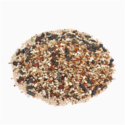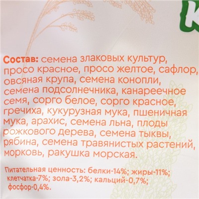 СОСТАВ: Семена злаковых культур, просо красное, просо желтое, сафлор, овсяная крупа, семена конопли, семена подсолнечника, канареечное семя, сорого белое, сорго красное, гречиха, кукурузная мука, пшеничная мука, арахис, семена льна, плоды рожкового дерева, семена тыквы, рябина, семена травянистых растений, морковь, ракушка морская.
