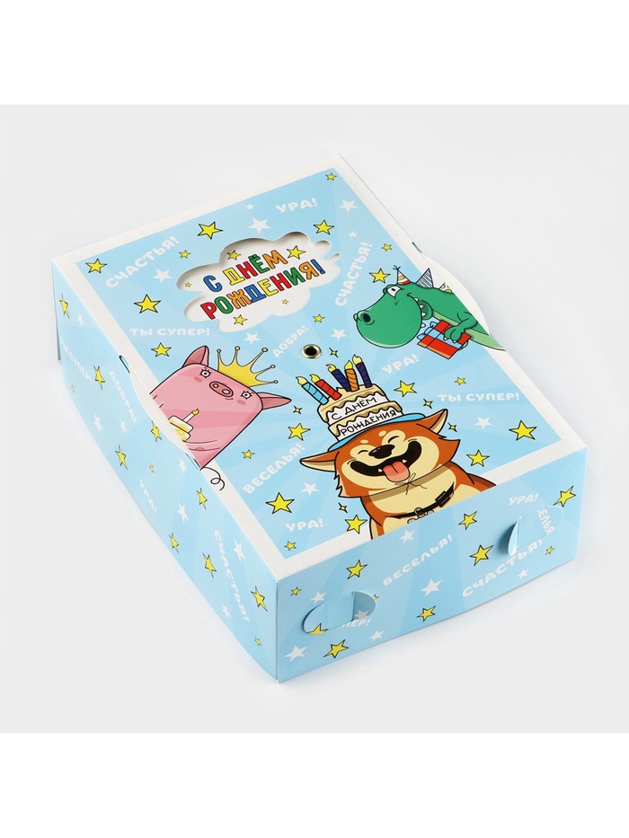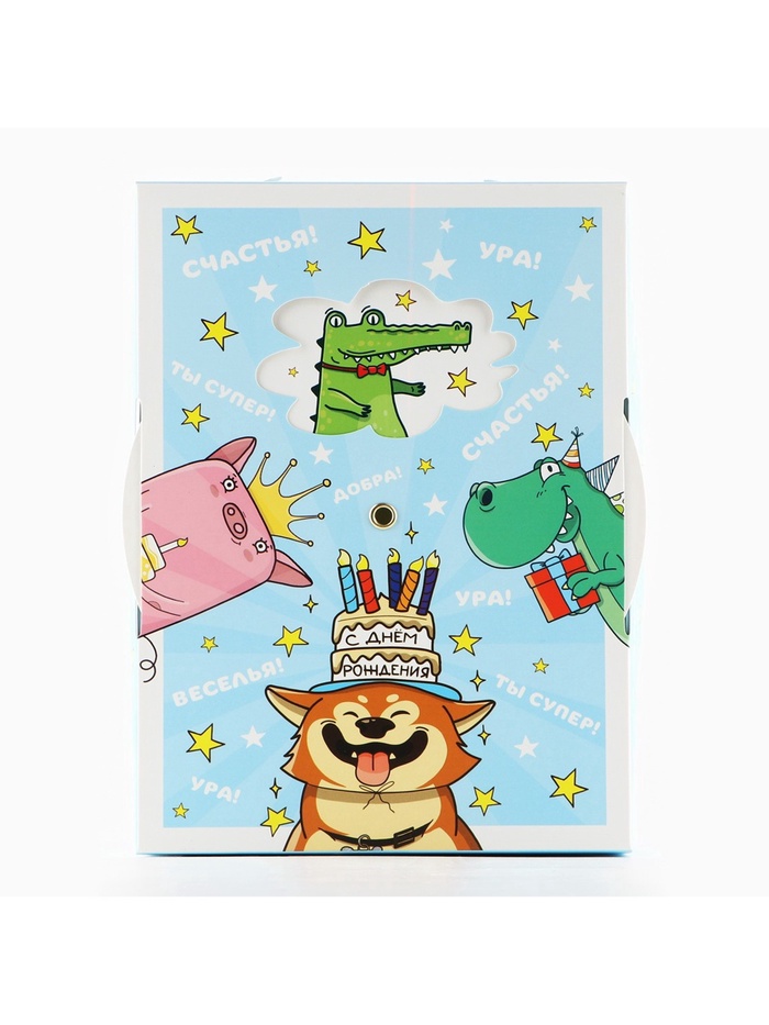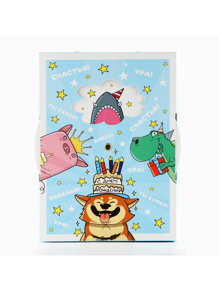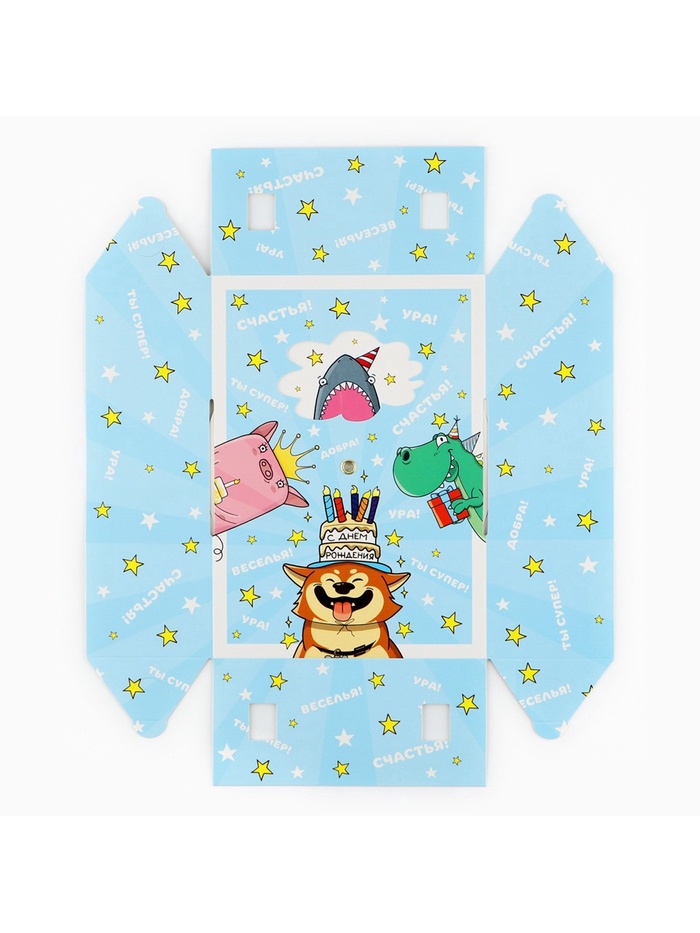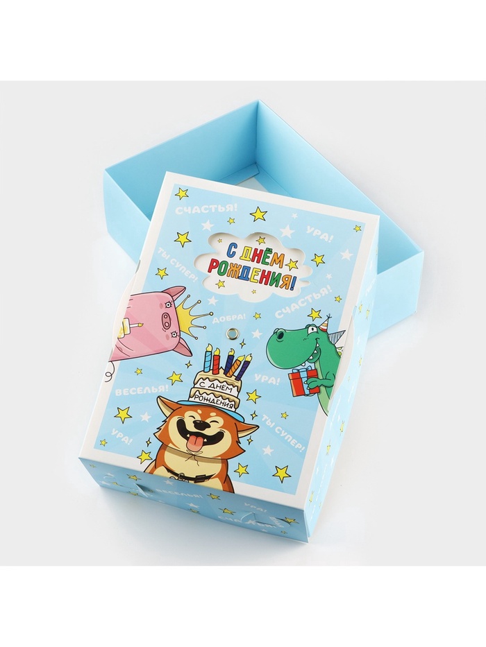 Производитель: Дарите Счастье; Габариты: 0,3 x 29 x 44; Страна: Китай; В боксе: 150 шт; Состав: Картон, металл; Материалы: картон, металл; Фасовка: по 1 шт; Индивидуальная упаковка: Пакет; Сертификат: ЕАС; Цвет: Голубой; Форма: Прямоугольная; Плотность, г/м²: 250; Длина, см: 21; Ширина, см: 15; Высота, см: 7; Допустимый вес вложения, г: 300; Тематика: Праздник; Тематика праздника: День рождения; Материал: Картон; Вид: Интерактивные; Размер: Средний (18-24 см); Окошко: Нет; Крышка-дно: Да; Фиксированная цена: Да
