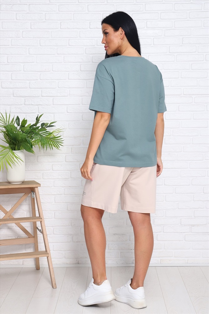 Костюм женский с шортами: футболка (кулирка) с коротким рукавом, спущенное плечо, шорты (футер 2-х нитка) с кантом спереди, с принтом и боковыми карманами. Актуальный силуэт, благородная расцветка и комфортные материалы.