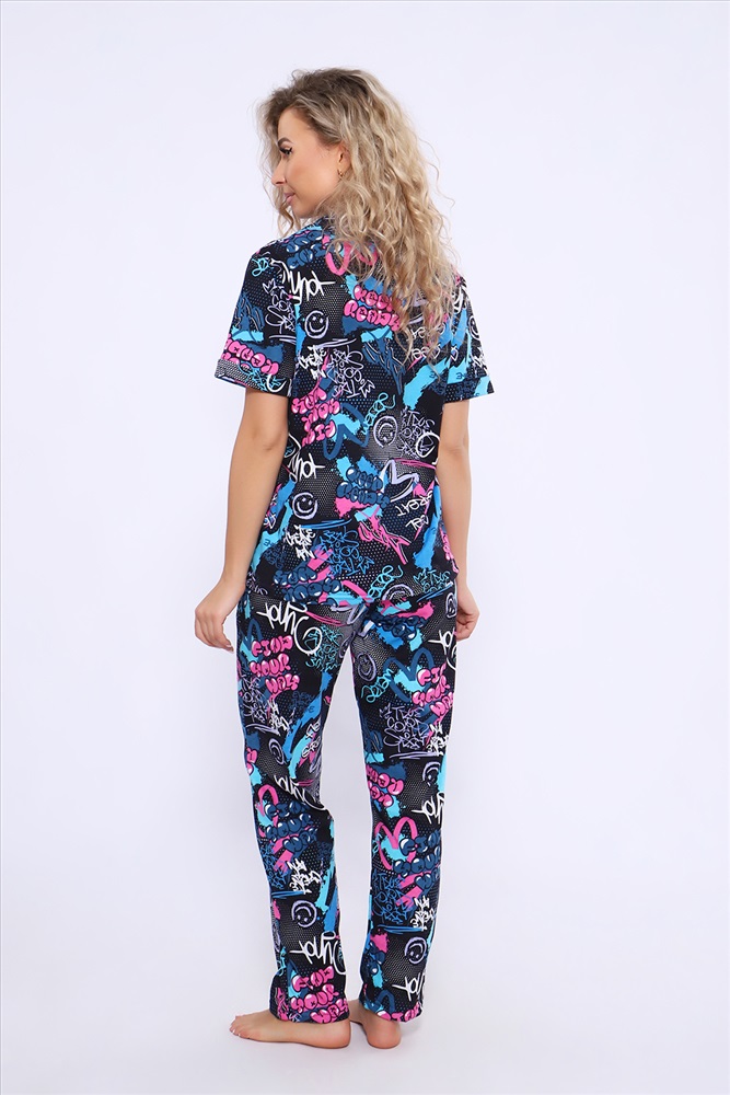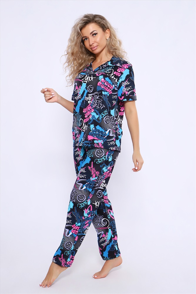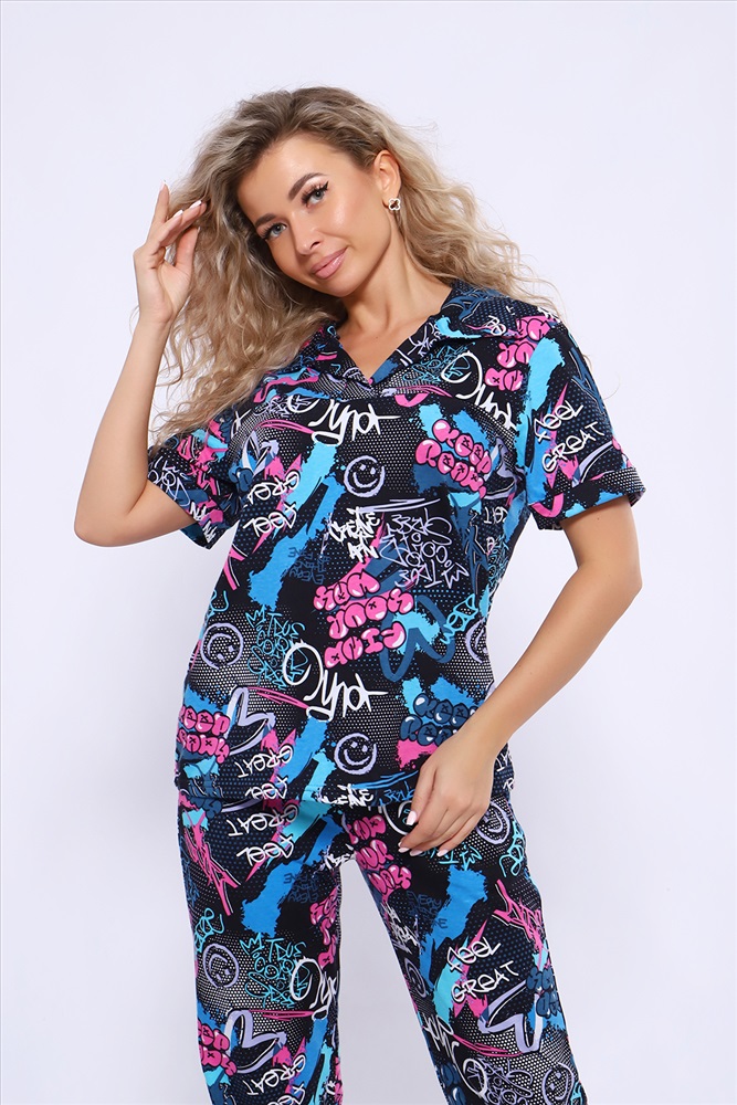Состав: 100% хлопок Модель: Костюм 13296 Тип товара: костюм с брюками Материал: кулирка | кулирка Бренд: Натали Суслова Карман: боковые Назначение: для дома Особенности: на резинке Отделка: с карманами Посадка: средняя посадка Рисунок: абстракция | разное Рукав: короткий рукав Сезонность: лето | осень | весна | зима Силуэт: прямой | свободный Стиль: домашний Воротник: отложной воротник | рубашечный воротник Застежка: без застежки Костюм состоит из футболки и брюк. Футболка с рубашечным воротником и короткими рукавами с манжетами. Брюки с карманами. Таблица размеров и весафутболка