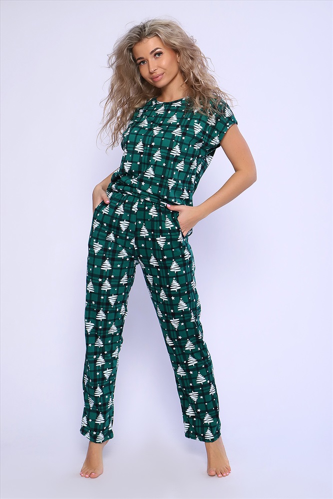 Костюм состоит из футболки и брюк. Футболка свободная со спущенным плечом. Брюки прямые с карманами по бокам.