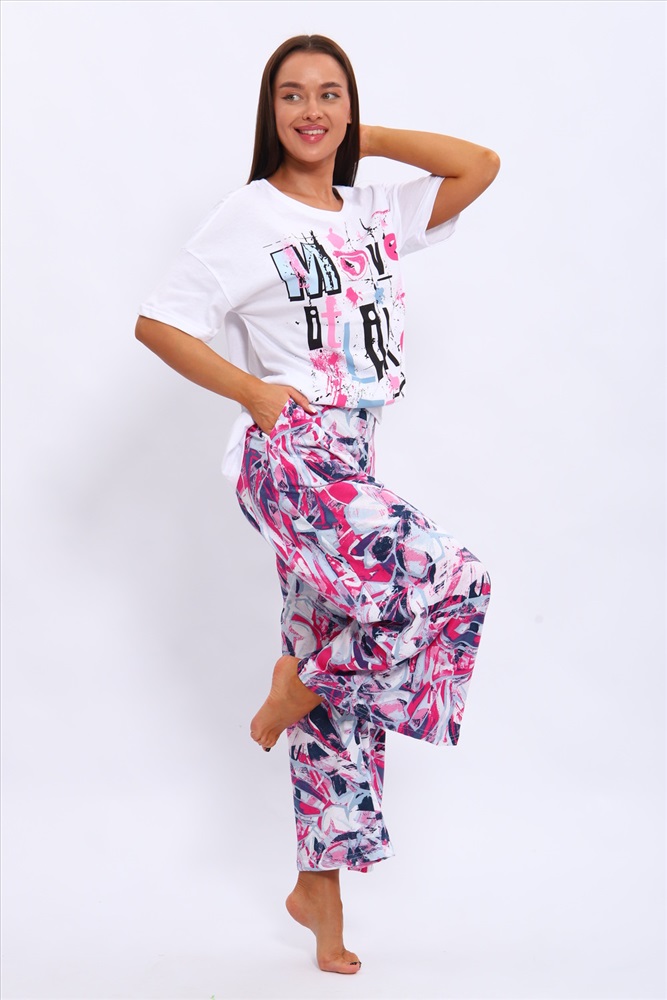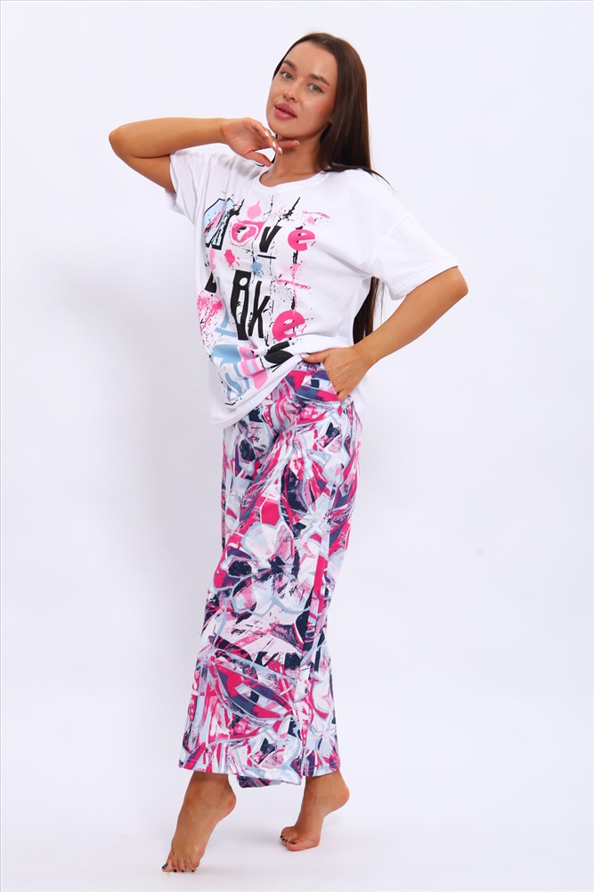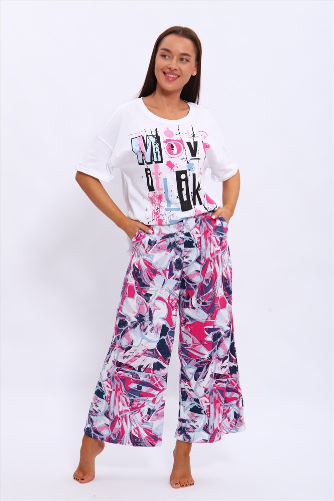 Состав: 100% хлопок Модель: костюм 70124 Тип товара: костюм с брюками Материал: кулирка | кулирка Бренд: EliasLine Карман: боковые Назначение: для дома Особенности: на резинке Отделка: с карманами | с печатью Рисунок: надпись | цветы Рукав: короткий рукав Сезонность: лето | осень | весна | зима Силуэт: свободный Стиль: домашний Воротник: без воротника Застежка: без застежки Костюм из кулирки . Футболка и брюки выполнены из мягкого и дышащего 100% хлопка. Большие размеры, футболка со спущенным рукавом с принтом, а брюки набивание широкие с карманами. Таблица размеров и весафутболка