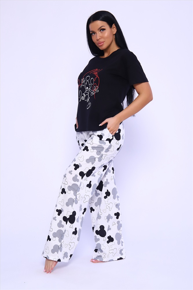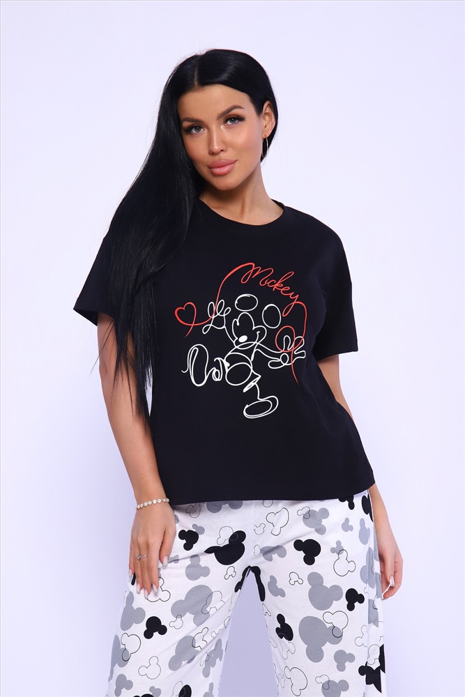 Женский домашний костюм-пижама, состоящий из футболки и брюк Микки из трикотажного полотна 100% хлопка. Приятный дышащий материал идеален для изготовления домашней одежды. Футболка свободного кроя, с круглой горловиной и втачным спущенным коротким рукавом, в которой будет одинаково приятно спать и заниматься домашними делами. Оригинальный, яркий принт обязательно поднимет настроение. Брюки прямого силуэта свободного кроя, с карманами в боковых швах. Мягкий удобный пояс на резинке не перекрутится, т.к отстрочен на поясной машине. Пижамка не изменит свой внешний вид после стирки при соблюдении рекомендаций по уходу и будет долго вас радовать. Отличный подарок для всех девушек и женщин на любой праздник!