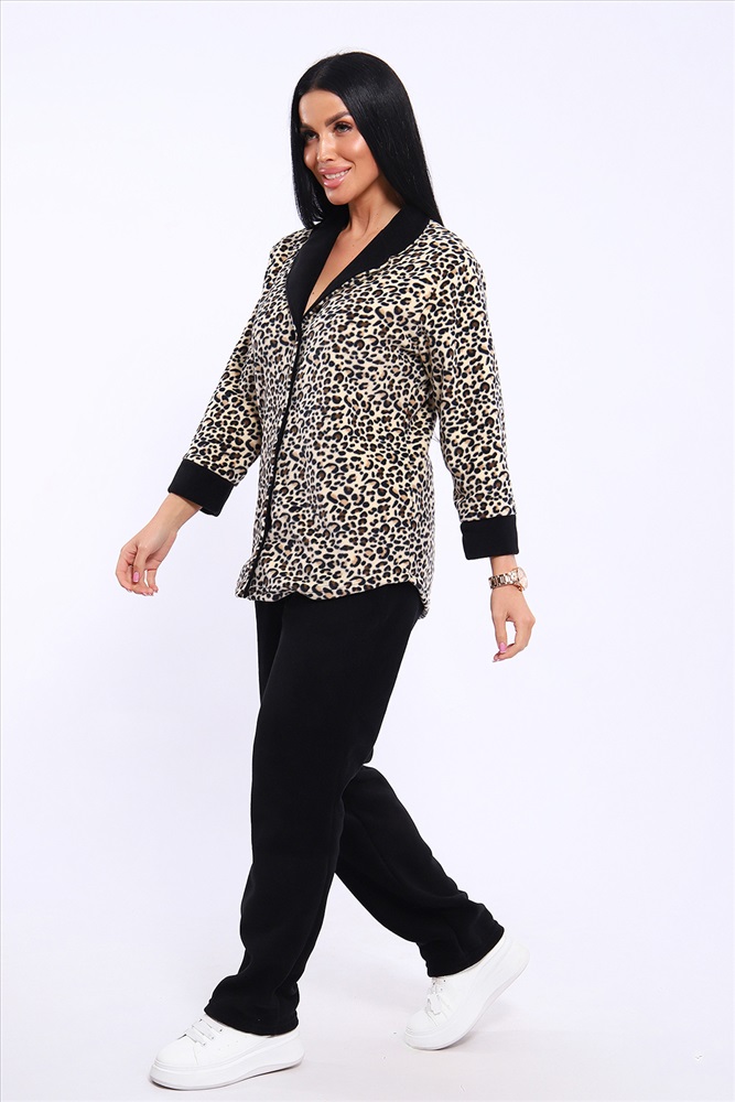 Домашний женский костюм из мягкого, теплого флиса. Кофта полуприлегающего силуэта, застегивается на петли и пуговицы. Длиной до бедер с фигурной линией низа. Рукав втачной, длиной 3/4 с манжетом из отделочной ткани. Воротник пиджачного типа с закругленными углами, из отделочной ткани. Борта, воротник и лацканы отстрочены. Домашние брюки прямого кроя с вместительными карманами в боковом шве, комфортный пояс на резинке, располагается на линии талии, длина брюк ниже щиколотки.