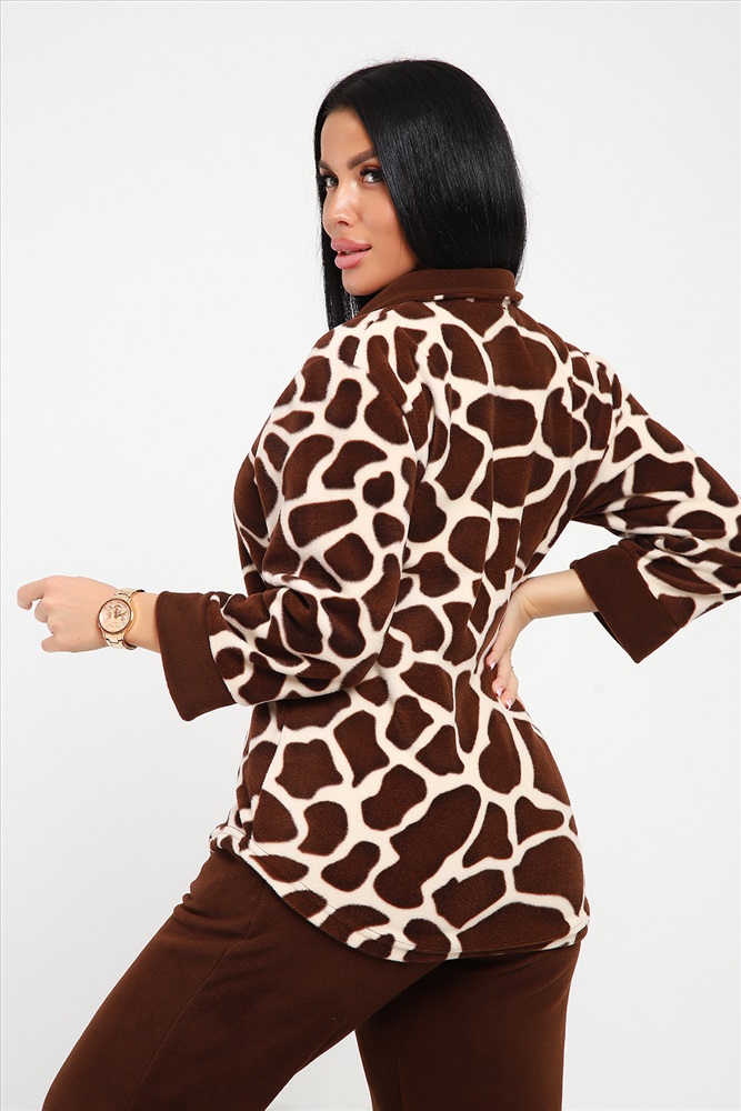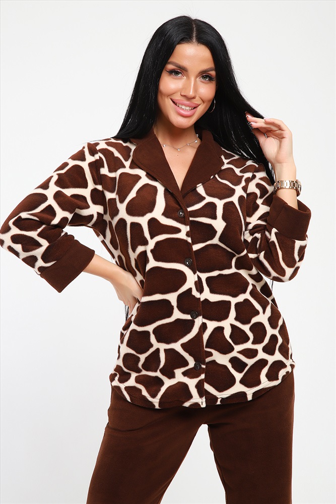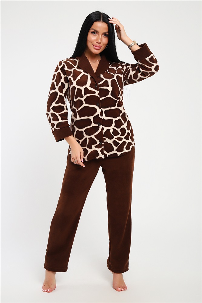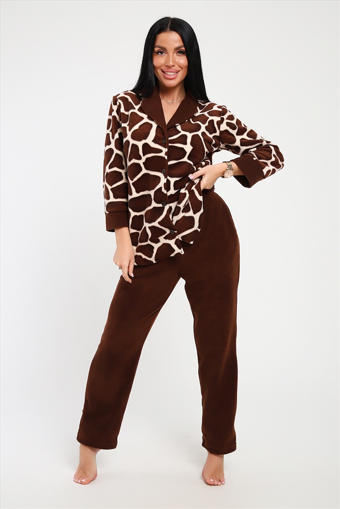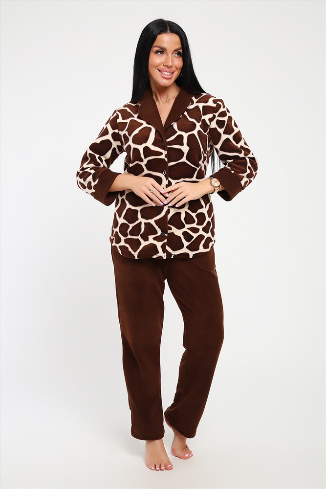Домашний женский костюм из мягкого, теплого флиса . Кофта полуприлегающего силуэта, застегивается на петли и пуговицы. Длиной до бедер с фигурной линией низа. Рукав втачной, длиной 3/4 с манжетом из отделочной ткани. Воротник пиджачного типа с закругленными углами, из отделочной ткани. Борта, воротник и лацканы отстрочены. Домашние брюки прямого кроя с вместительными карманами в боковом шве, комфортный пояс на резинке, располагается на линии талии брюк ниже щиколотки.