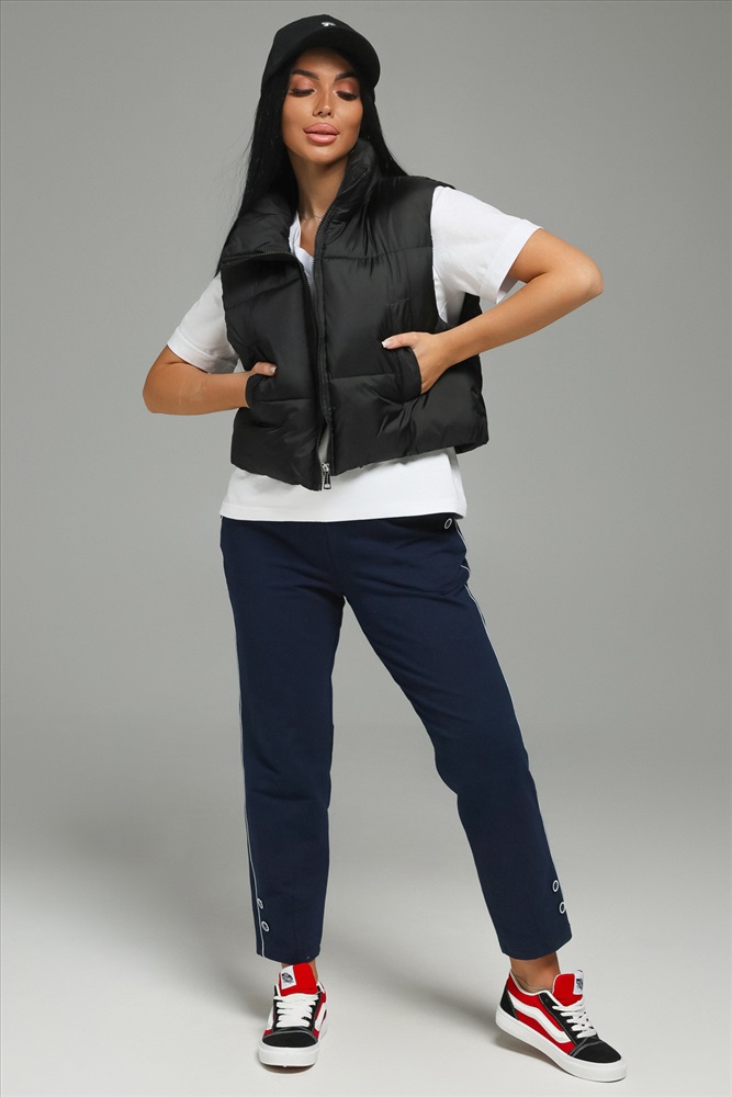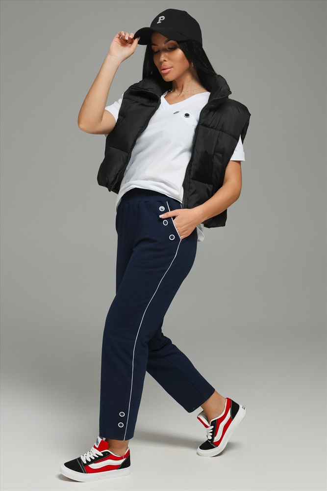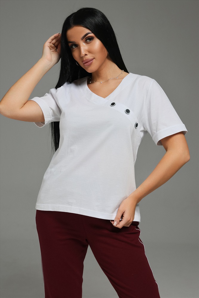 Брючный трикотажный костюм - это стильный и элегантный предмет гардероба, идеально подходит для дома и отдыха на любой период: весенний, осенний, летний и зимний. Костюм состоит из брюк и футболки, выполненный из высококачественного трикотажного материала. На карманах и по низу брюк декор дополнен декоративными пуговицами, как и на обтачке по фигурной планке. Изысканный комплект является идеальным выбором для всех, кто ценит качество и элегантность.