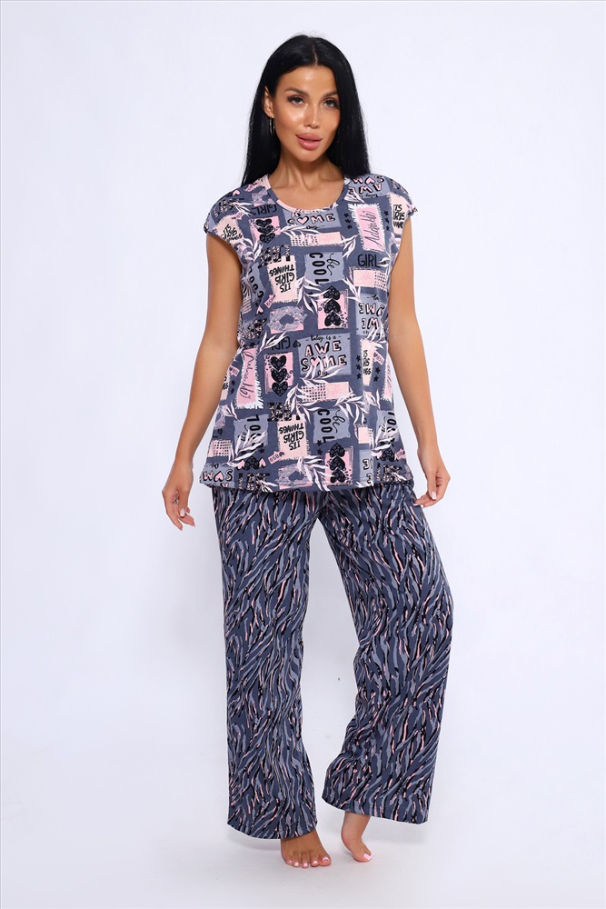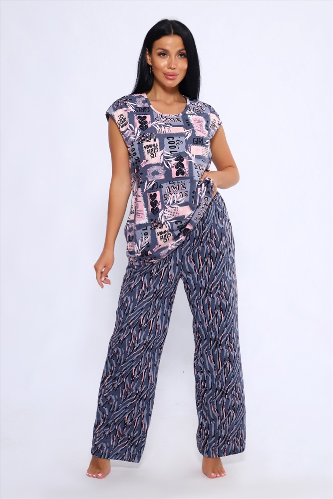 Женский костюм из 100% хлопка, длинные широкие брюки на эластичной резинке по талии шириной 3 см., с карманами в боковых швах и футболкой со спущенным плечом. Брюки в двух расцветках. Интересное и актуальное цветовое сочетание серых и розовых оттенков отличный вариант. Брюки и футболку можно сочетать и с другими предметами вашего гардероба. Ткань не просвечивает и имеет эластичность, обеспечит комфортное времяпрепровождение вашего досуга как дома так и на отдыхе. На фото модель представлена в 48 размере.