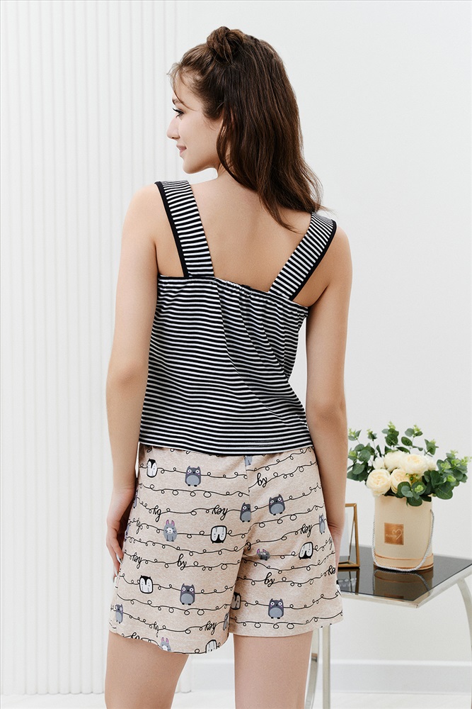 Комплект состоит из майки и шорт. Майка на широких бретелях, с квадратной горловиной на полочке. Верх спинки собран на резинке. Горловина полочки и проймы обработаны бейкой из отделочного полотна. Шорты прямые, на резинке, со складками спереди.