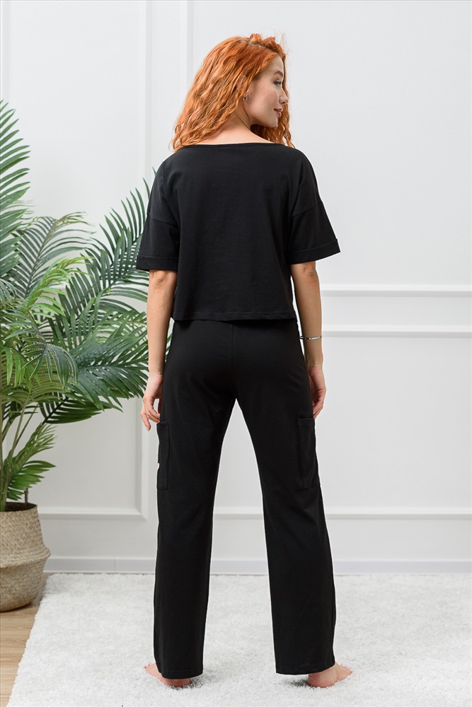 Костюм состоит из укороченной футболки оверсайз и брюк. Футболка с округлой горловиной. Рукав короткий, с манжетом. Горловина обработана бейкой из основного полотна. Брюки прямые, на поясе, с боковыми карманами, с накладными карманами по боковым швам.