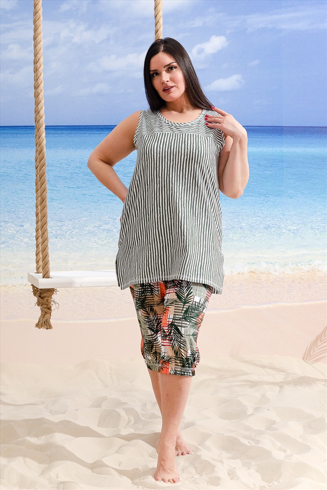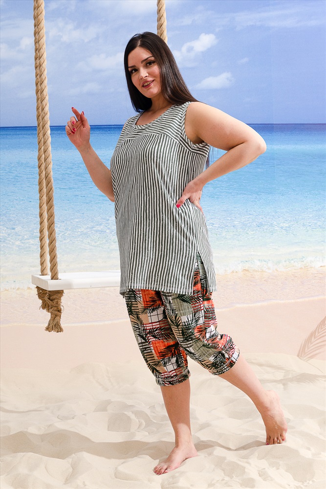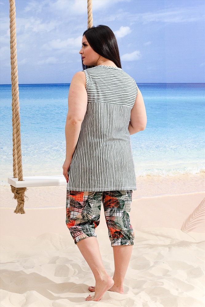 Костюм женский: майка и бриджи. Майка слегка расширенная к низу, в боковом шве разрезы. На полочке и спинке кокетки. Бриджи свободные по бедрам, низ брюк собран на эластичную тесьму. Пояс выполнен на многоигольной машине, на передних половинках внутренние карманы.
