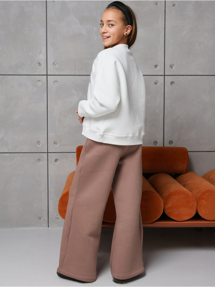 Теплый трикотажный костюм из футера с начесом для девочек. Спортивный костюм изготовлен из мягкого и приятного на ощупь материала на хлопковой основе производства Турция, обладает износостойкостью, не растягивается и не теряет своей формы. Начес может «сыпаться» или оставаться на одежде первые дни – это нормальное явление обусловленное технологией производства ткани, через пару стирок оно пройдет, что никак не скажется на теплоте и плотности костюма. Состоит из свитшота с принтом и штанов палаццо. Удобное лекало, не сковывающее движений, яркий принт, современный дизайн – подчеркнет индивидуальность и подарит комфорт. Кофта с модным леопардовым принтом закрывает поясницу и имеет декоративный разрез сзади. На брюках так же расположена стилизованная надпись, пояс на мягкой эластичной резинке. Отлично подойдет как детям, так и девочкам подросткам. Наш трендовый костюм - это отличный выбор для девочек, которые хотят быть яркими, модными, следят за модой и ведут активный образ жизни. Детский комплект двойка в стиле кэжел подходит для повседневного использования, прогулок, путешествий, походов в детский сад или школу, а также для особых случаев, таких как День Рождения, фотосессия, в гости, на праздник или в подарок. Флисовый детский костюм (костюм на флисе) в базовых расцветках обязательно полюбится вашим прекрасным девочкам и вам.