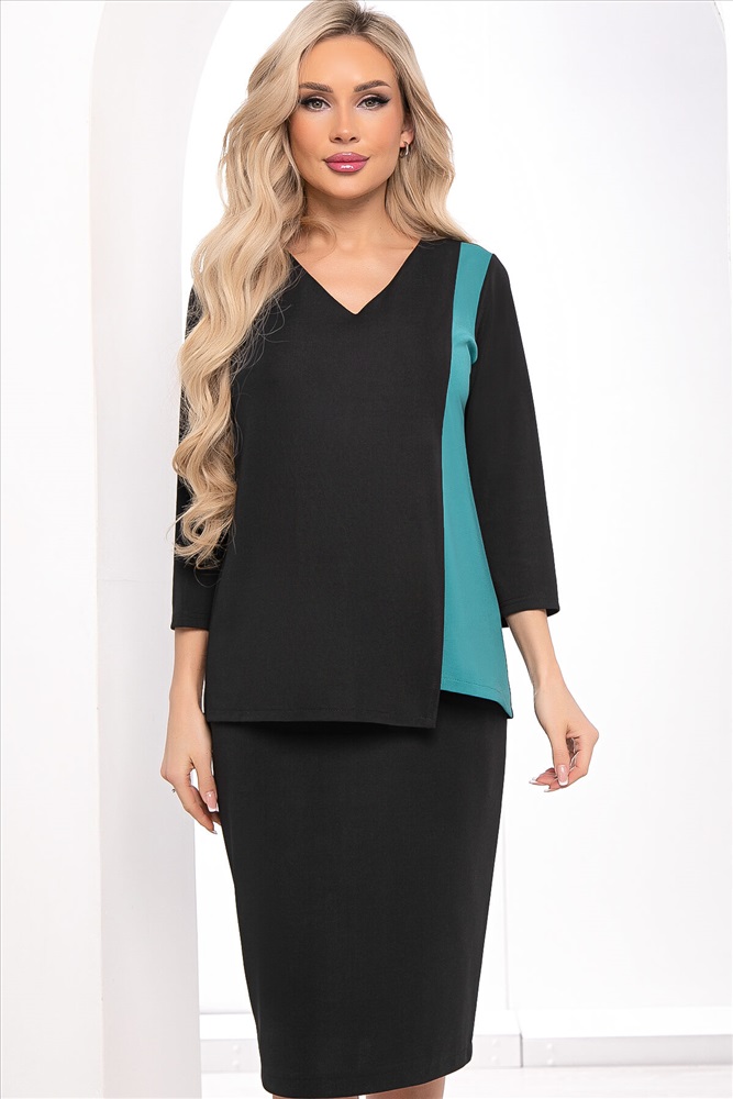 Костюм-двойка, состоящий из юбки на резинке и блузы с поясом и пряжкой. Очень удобный комплект для офиса и деловых встреч. Комфортный костюм в черно-бирюзовом цвете с трендовой асимметрией. Блуза свободного кроя с V-образным вырезом горловины, рукав втачной, укороченный. Юбка прямого кроя, по талии на комфортной резинке. Завершается образ элегантным вырезом по низу юбки.