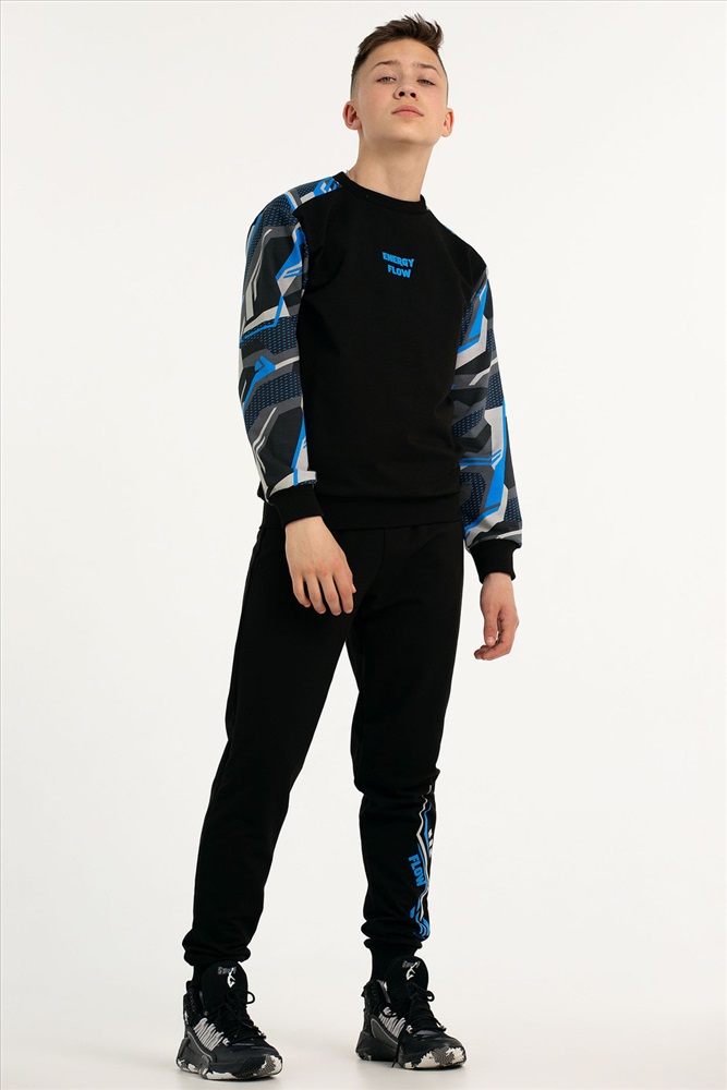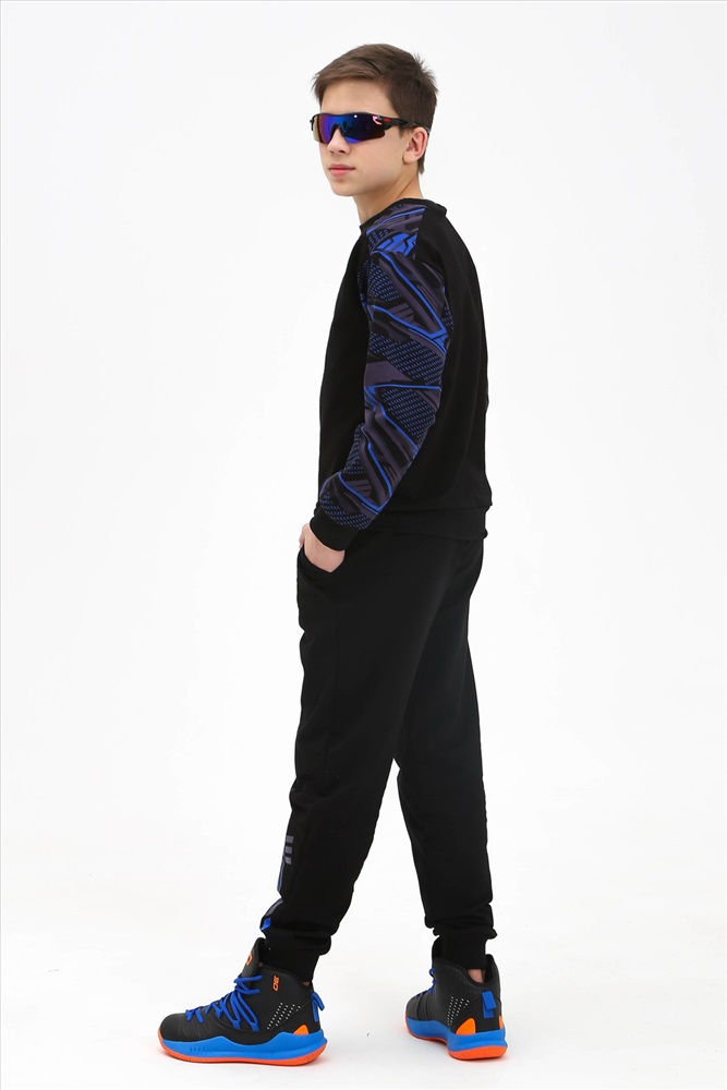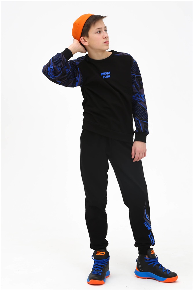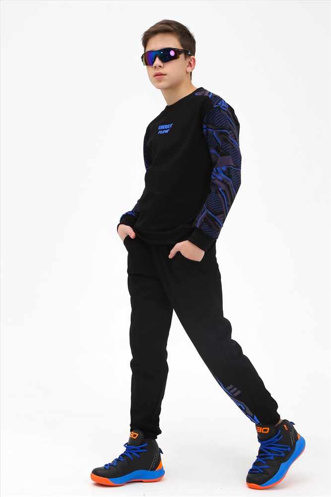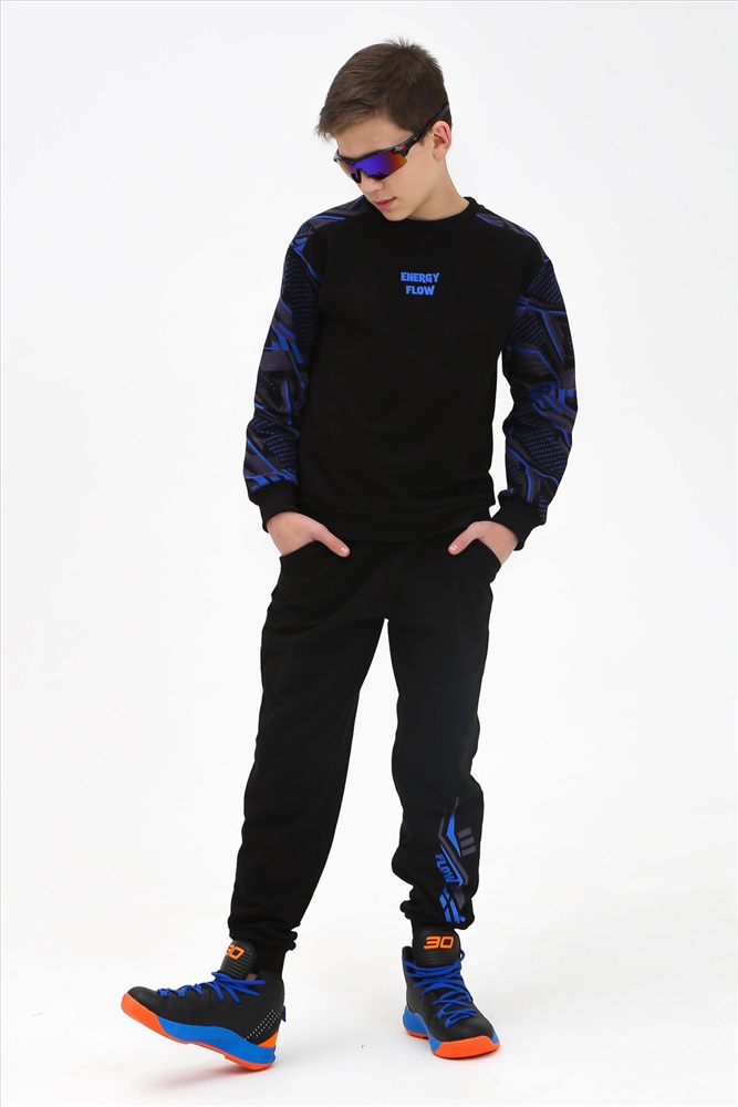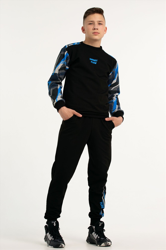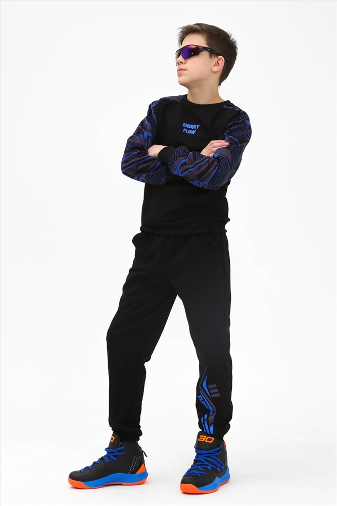 Костюм свободного кроя выполнен из футера 2-х нитки. Состоит из толстовки и брюк. Толстовка с манжетами и поясом из эластичного трикотажа. Рукав втачной со спущенной линией плеча. Брюки свободной посадки с карманами и манжетами из эластичного трикотажа.