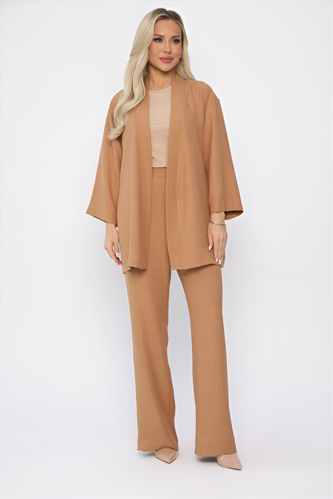 Костюм выполнен из легкой ткани — отличный вариант для повседневной носки в летнюю погоду. Комплект двойки состоит из рубашки в стиле кимоно со спущенным рукавом и прямых брюк, которые по талии на резинке. Вы сможете носить их как вместе, так и раздельно. Комфортный комплект в свободном стиле, благодаря своей посадке, отличный вариант не только для городского образа, но и для походов на пляж. В комплекте пояс из основной ткани.
