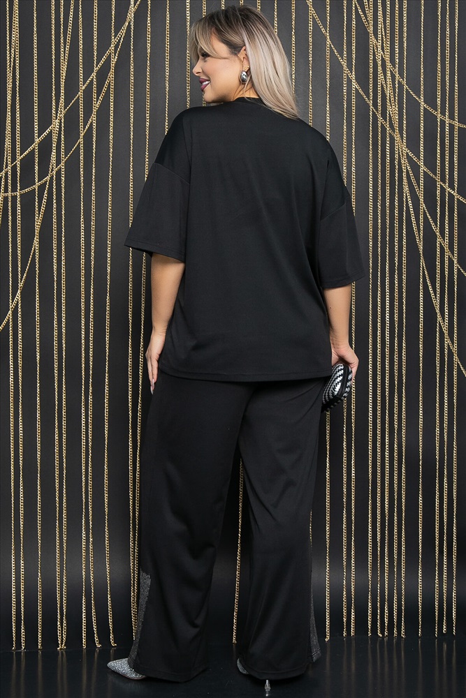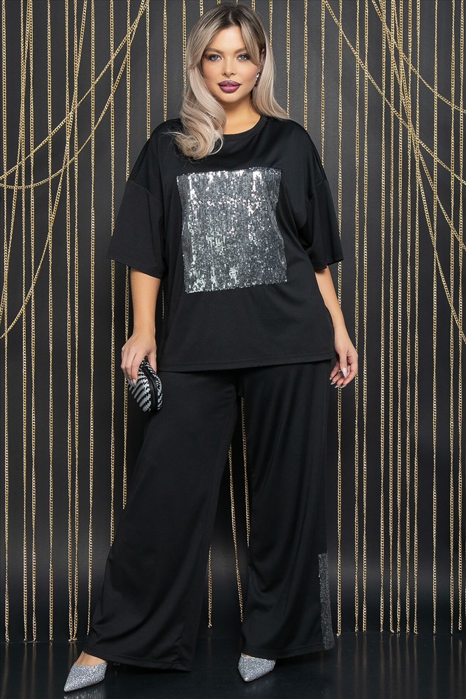 Трикотажный костюм из приятной к телу шелковистой ткани в дерзком черном цвете. Верх костюма состоит из оригинальной блузы свободного кроя. Блуза декорирована качественными пайетками в виде квадрата. Свободные брюки придают костюму легкость и особый шик. Брюки имеют пояс на комфортной резинке, что позволяет чувствовать себя свободно и не сомневаться при выборе размера. Брюки также декорированы пайетками по боковой стороне брюк снизу. Свободный силуэт костюма подходит абсолютно для любой фигуры. Оригинальный костюм для любого мероприятия позволит вам чувствовать себя элегантно, дорого и в тренде.