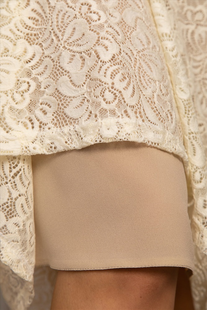 Познакомьтесь с потрясающим женским костюмом в нежных бежевых тонах. Он состоит из кружевной юбки и атласного топа. Эти два контрастных материала создают изысканный и элегантный ансамбль.