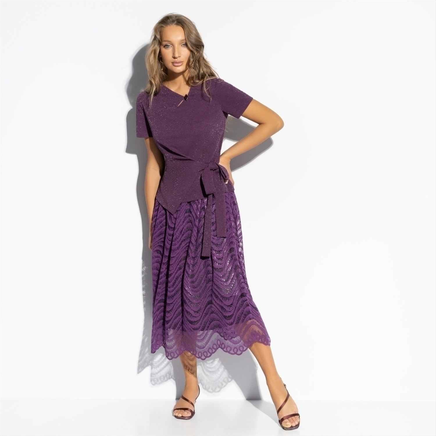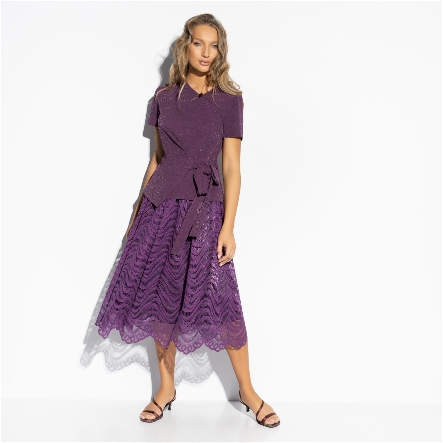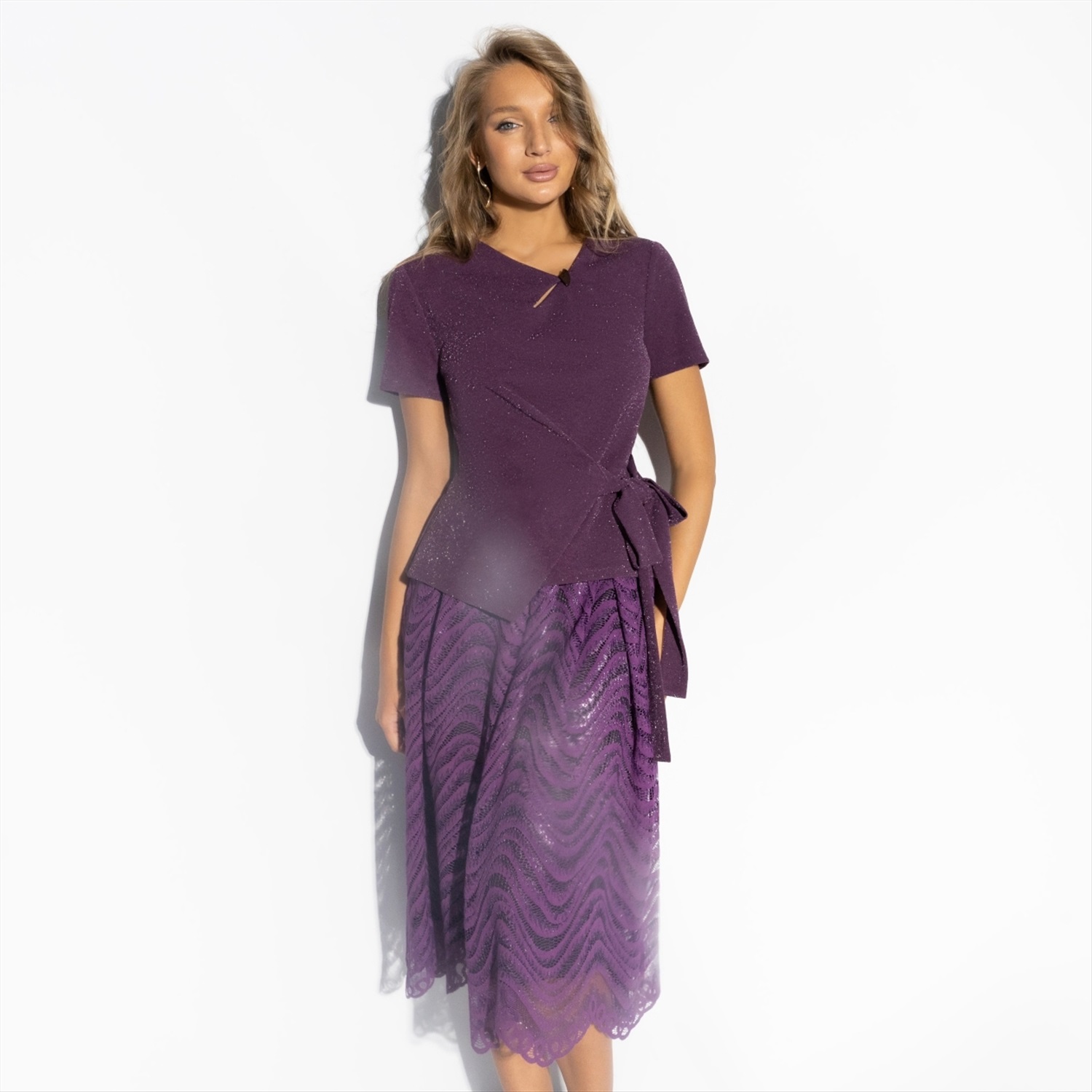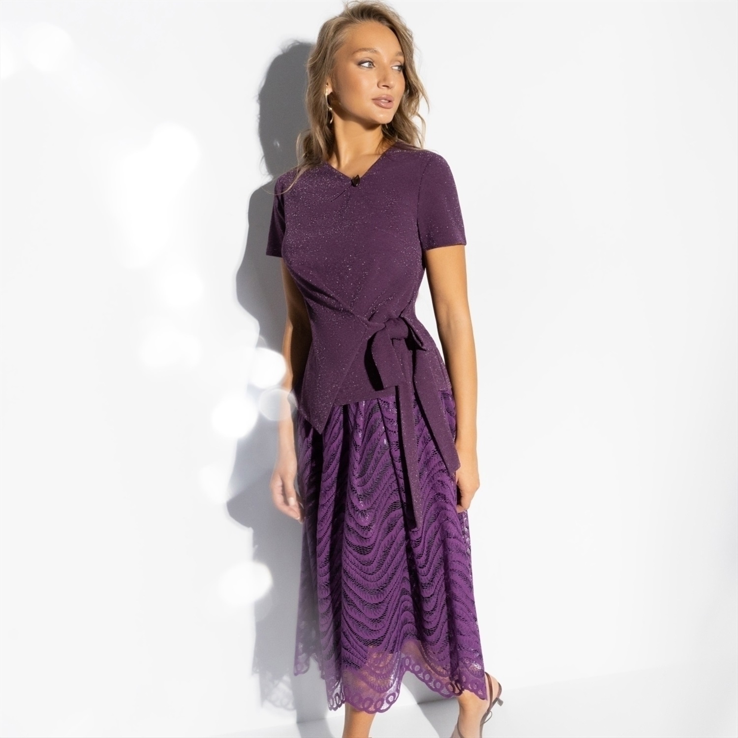 ТН ВЭД: 6104130000; Состав: Трикотаж «креп», кружево, подклад (95% п/э, 5% спандекс); Плотность ткани: Средняя; Тип ткани: Трикотаж; Вид застежки: Пуговица/-ы; Декоративные элементы: Драпировка; Карманы: Нет; Основной цвет ткани: Фиолетовый; Отрезная талия: Нет; Подклад: Есть; Резинка по талии: Есть; Рисунок/раппорт: Нет, все изделия идентичны; Сезон: Круглогодичный; Силуэт: Приталенный; Стиль: Нарядный