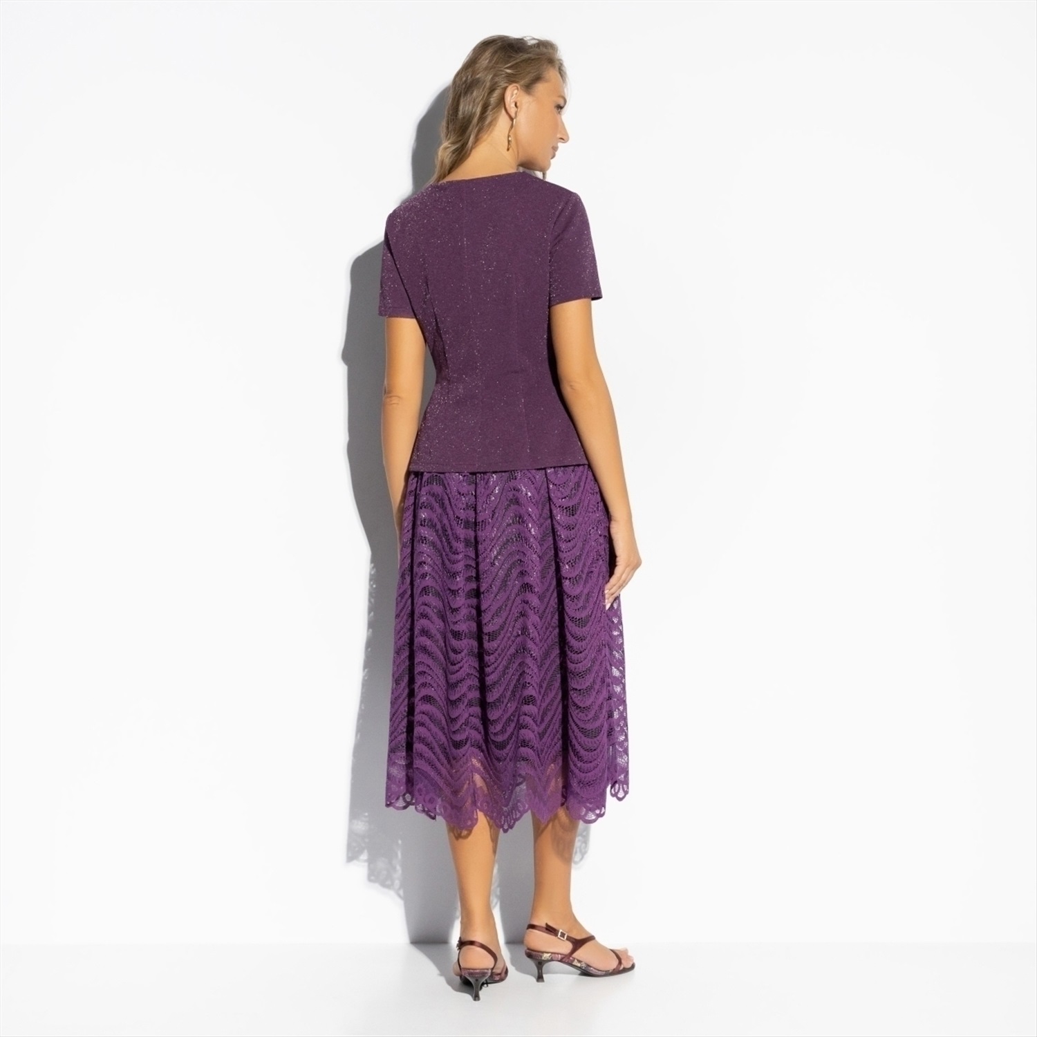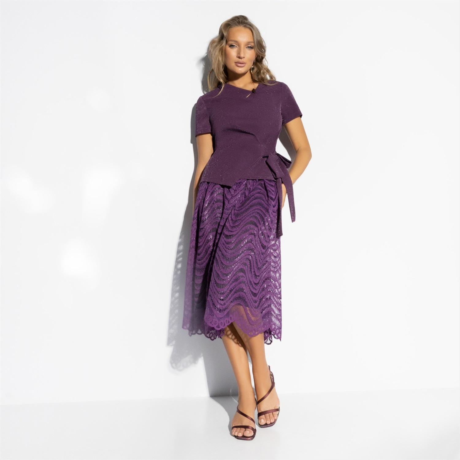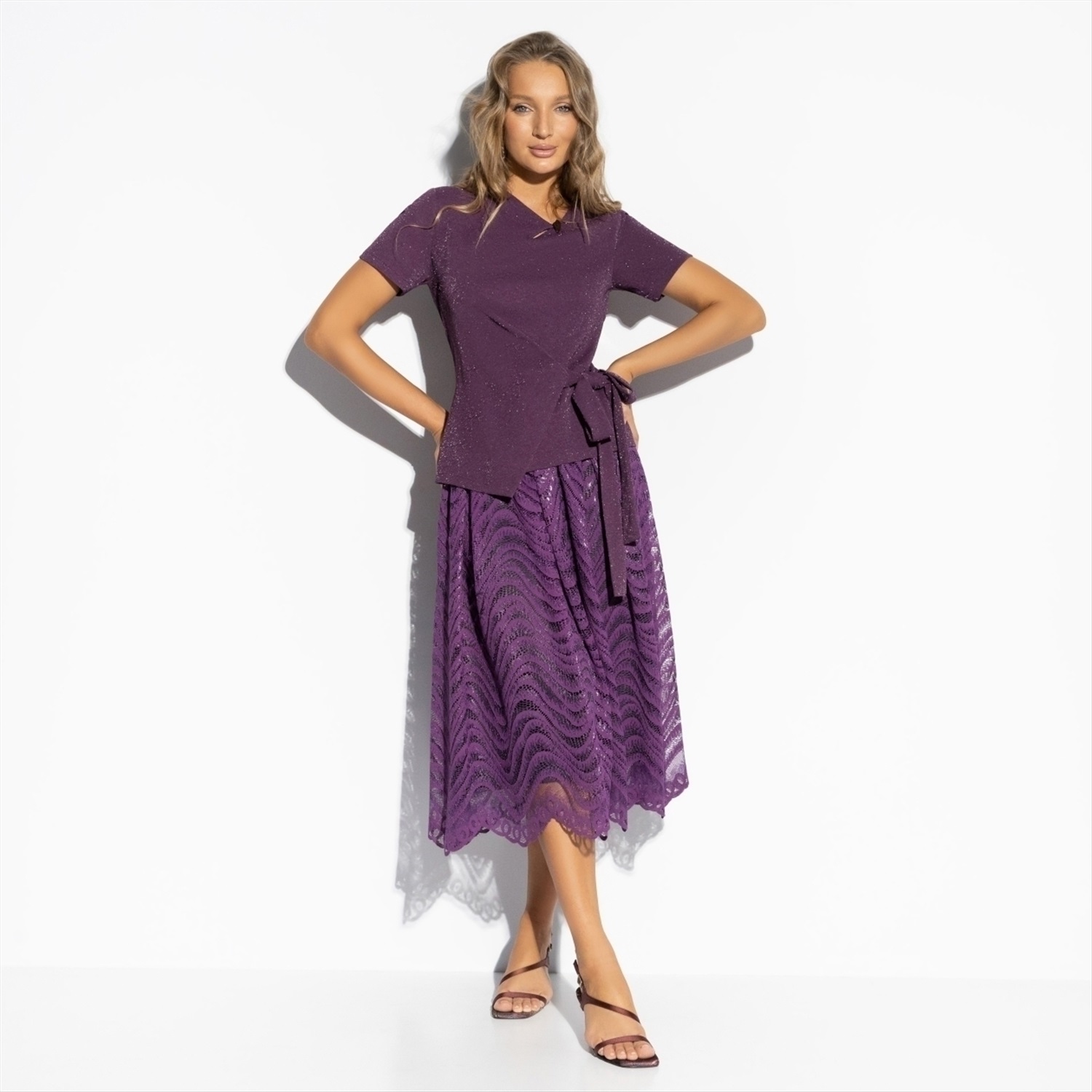 Так красиво, перестаю дышать... Этот аметистовый оттенок делает образ особенным – загадочным, магическим, совершенно неземным. Мерцающее сияние ткани создаёт вокруг ореол тайны заставляя поверить: рядом происходит настоящая магия. Топ с драпировкой и бантом, юбка на резинке с изящным узором. Для волшебных встреч и незабываемых моментов!