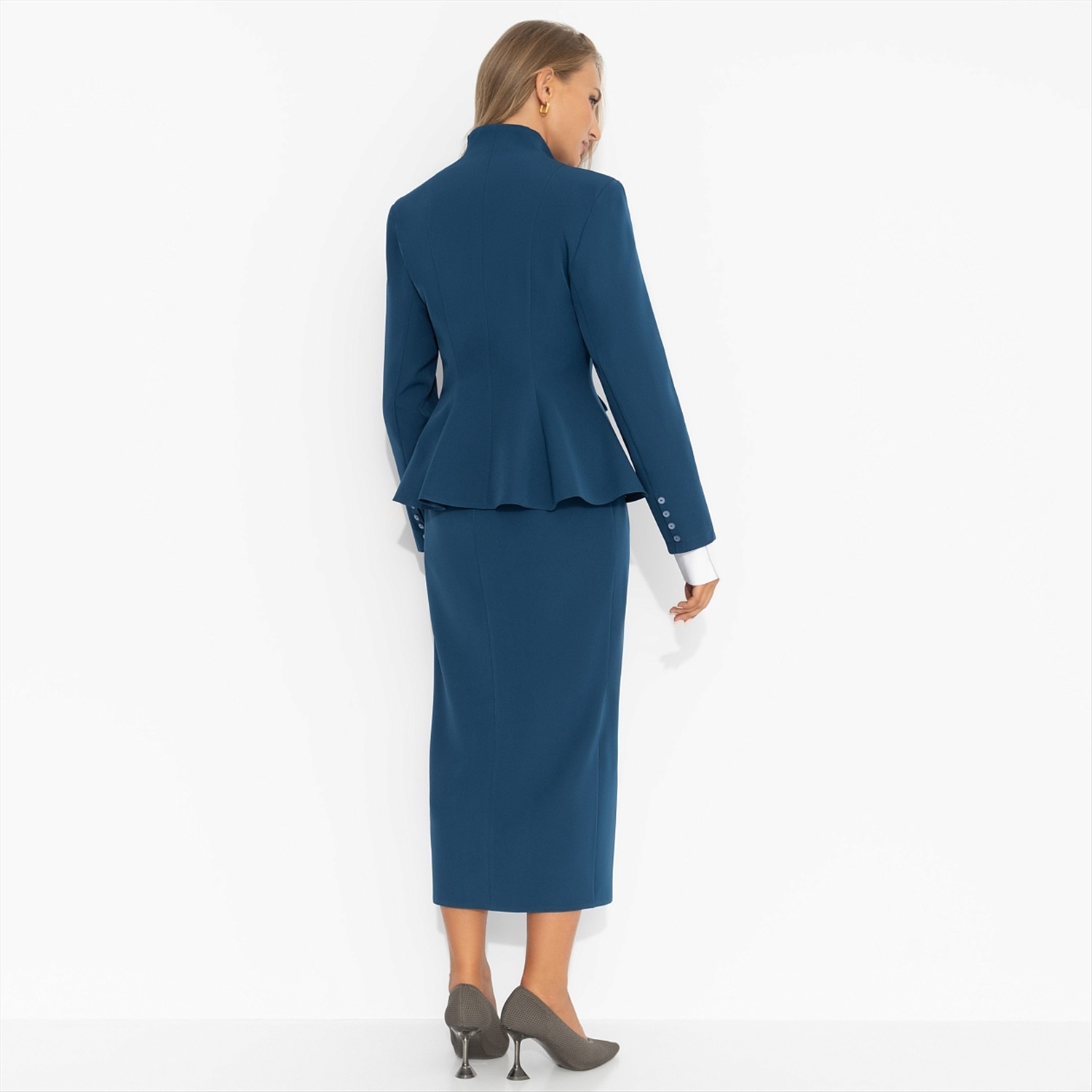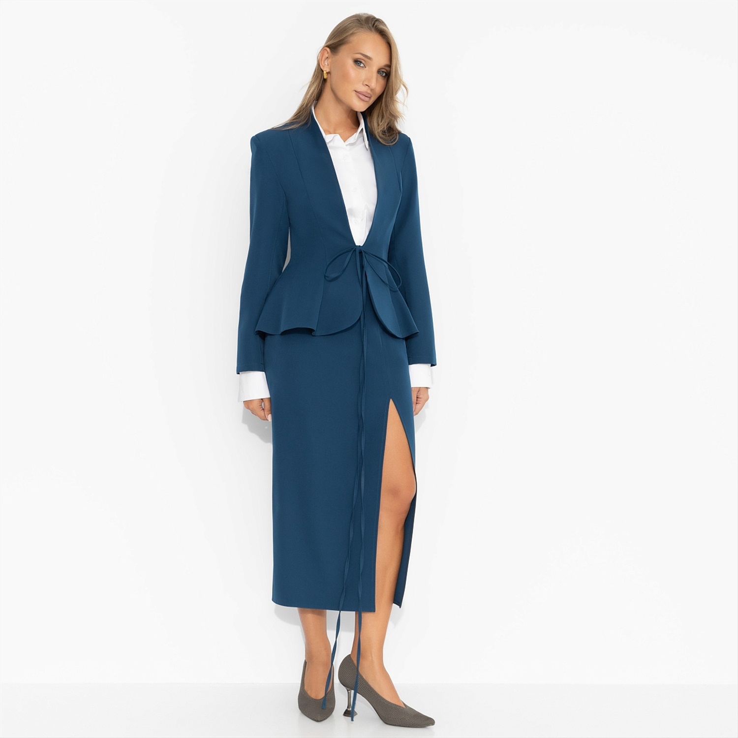 Каждое утро начиналось с дефиле к своему рабочему месту. Таковы преимущества работы в open space пространстве. Костюм ЧАРУТТИ создан именно для такой профессии, предполагающей долгие прогулки по офису. Иначе как все увидят идеально сидящий жакет и юбку с разрезом?! Работа мечты – это когда тебе есть куда прийти в своем лучшем наряде. Комплект состоит из юбки в длине миди и укороченного жакета. Юбка с глубоким разрезом застегивается на скрытую молнию. Жакет приталенного силуэта с тонкими завязками.