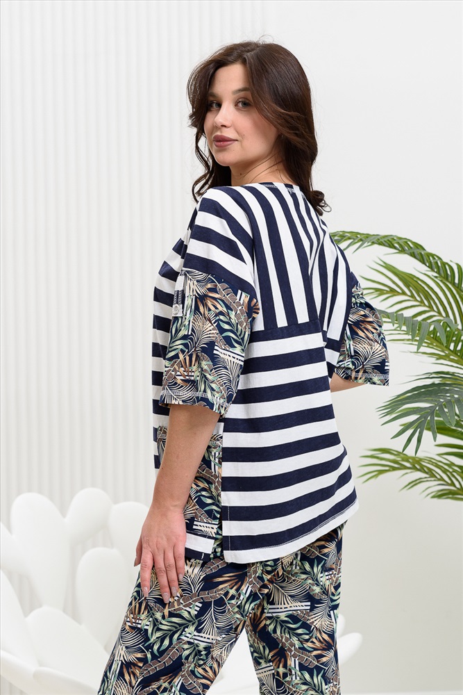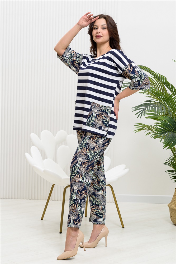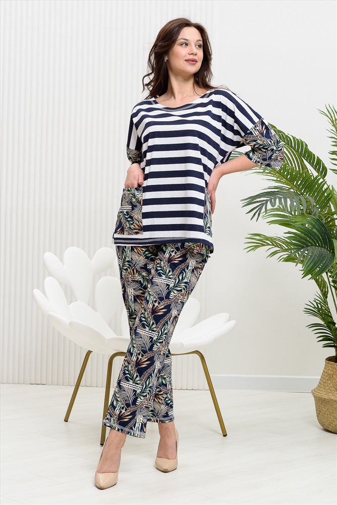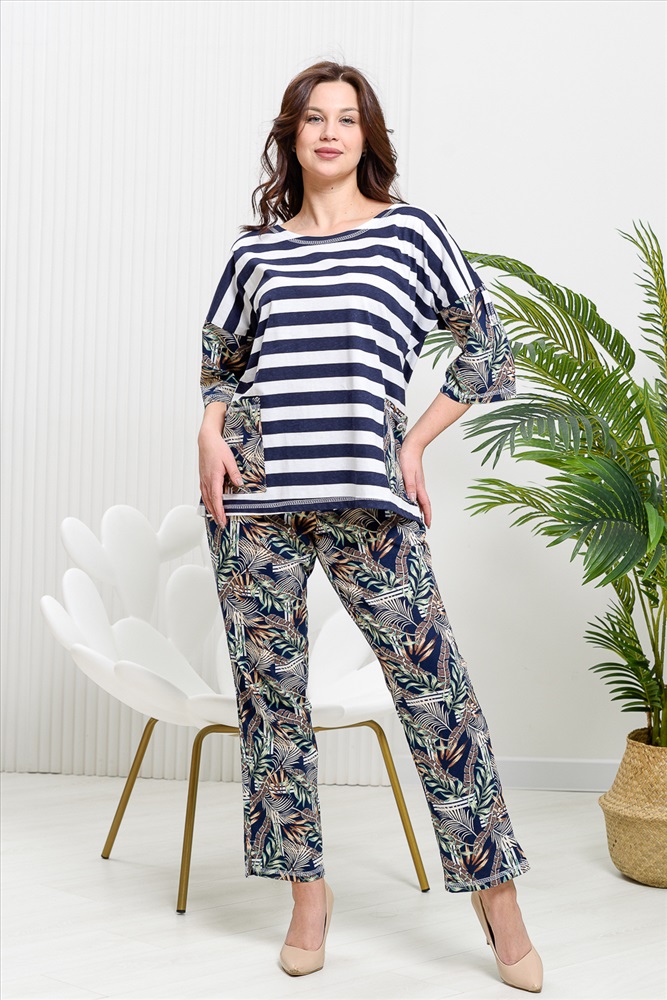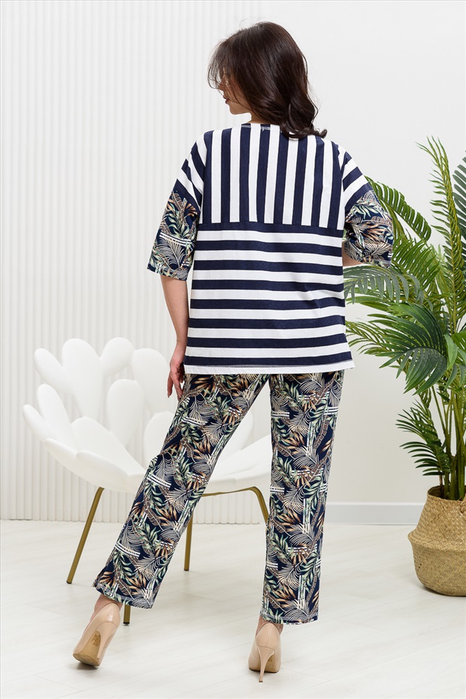 Костюм женский: туника и брюки. Туника прямого силуэта с округлой горловиной. Рукав цельнокроенный со швом, ниже локтя. На полочке два накладных кармана. Брюки полуприлегающие, с притачным поясом, изготовленном на многоигольной машине. На передней части брюк два внутренних кармана. В боковых швах внизу брюк маленькие разрезы. Костюм достаточно творческий за счет использования ткани в широкую полоску и цветочного принта.