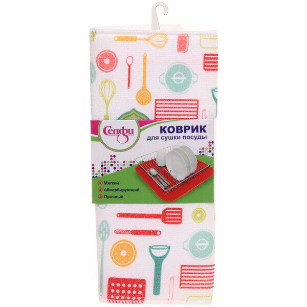 Бренд: Селфи; Индивидуальная упаковка: Подвес; Материал: 90%полиэстер, 10%поролон; ШтрихКод: 6931994154308; Страна происхождения: Китай; Количество в коробке: 240; Можно мыть в посудомоечной машине: Нет Коврик для сушки посуды будет хорошим дополнением на каждой современной кухне. На нем можно удобно размещать чистую посуду, и в кухонном шкафу он не займет много места. Если раньше вместо коврика использовалось полотенце или тканевая салфетка, то сейчас у хозяек есть огромный выбор.