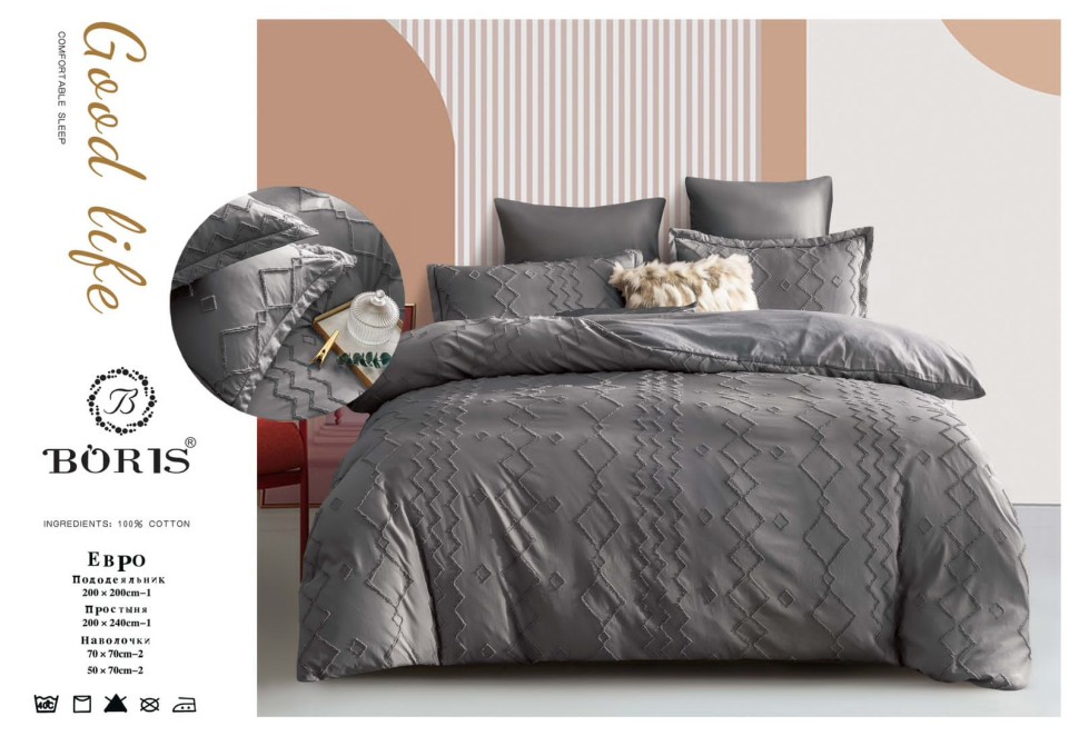 Производитель: BORIS; Коллекция: Boris Плюмети; Размер товара: Евро; Евро: пододеяльник 200х220 см, простыня 220х240 см, наволочка 50х70 см - 2 шт., наволочка 70х70 см - 2 шт.; Материал: Сатин; Состав: 70% хлопок / 30% микрофибра; Плотность: 120 г/м2; Категория: Коробочный товар; ВАЖНО!!!: ОРНАМЕНТ ЗАВИСИТ ОТ ПОСТАВКИ!, Подробную информацию можно уточнить у менеджеров., Цвет или оттенок изделия может отличаться от представленного на сайте фотоизображения ввиду различных настроек экранов и мониторов., Характеристики и комплектация товара могут быть изменены производителем без уведомления.