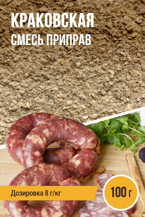 Производитель: ИП Агапкин ПА; Состав: перцы, мускатный орех, чеснок гранулированный, глюкоза.; Норма внесения: 8 г на 1 кг мясного сырья.; Подходит для: краковской колбасы, варено-копченой колбасы, копчено-вареной колбасы, сервелата, салями.; Количество в упаковке: 100 г.; Условия и сроки хранения: 24 месяца при комнатной температуре и относительной влажности воздуха 20...75% в герметичной упаковке.