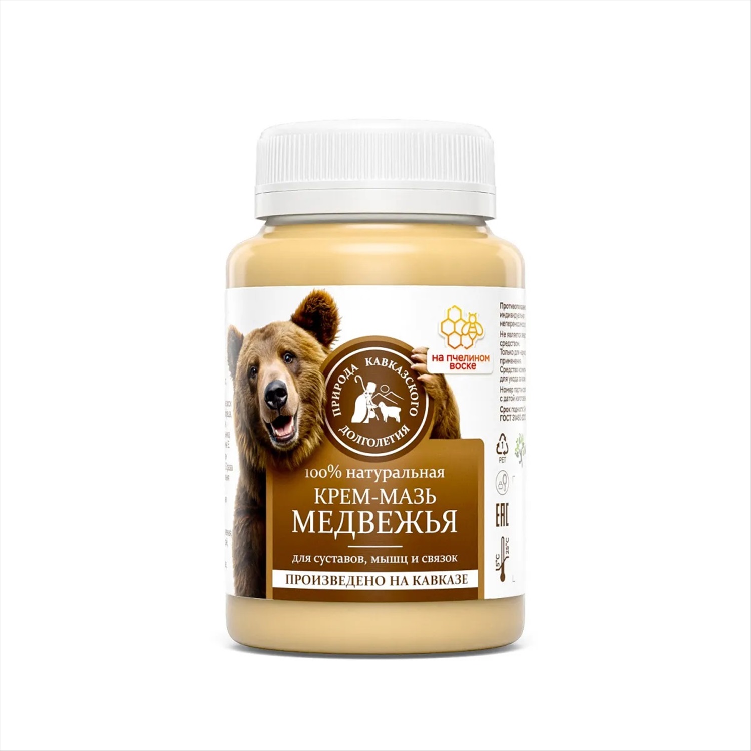 Воск пчелиный, масло облепиховое, экстракты календулы, прополиса, ромашки, тысячелистника, конского каштана,грязи Тамбуканского озера, витамин Е, мёд.