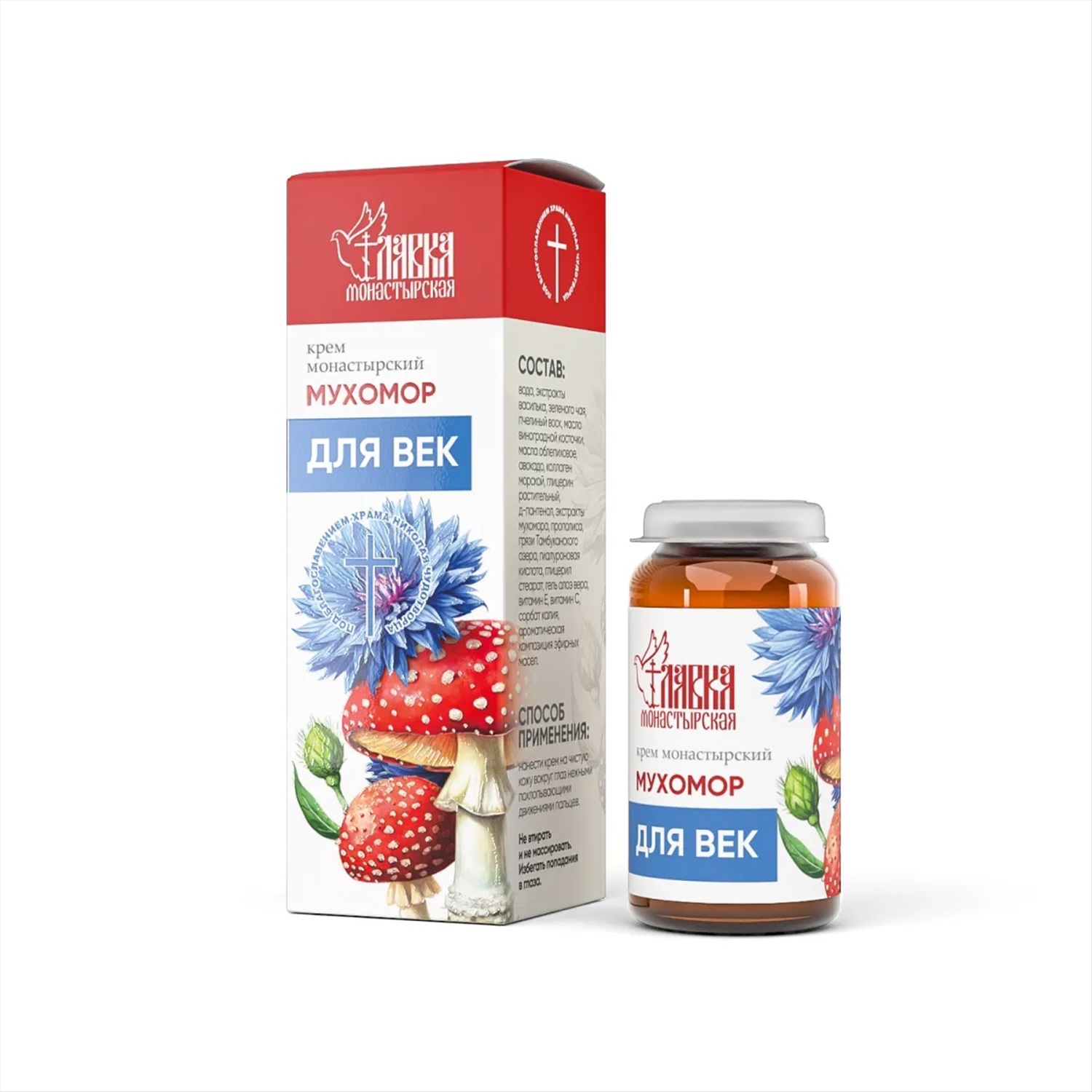 Производитель: «Монастырская лавка» Состав: Вода, экстракты василька, зеленого чая, пчелиный воск, масло виноградной косточки, масла облепиховое, авокадо, коллаген морской, глицерин растительный, д-пантенол, экстракты мухомора, прополиса, грязи Тамбуканского озера, гиалуроновая кислота, глицерил стеарат, гель алоэ вера, витамин Е, витамин С, сорбат калия, ароматическая композиция эфирных масел. Способ применения: Нанести крем на чистую кожу вокруг глаз нежными похлопывающими движениями пальцев. Не втирать и не массировать. Избегать попадания в глаза. Масляный экстракт гриба мухомора в сочетании с вытяжками целебных растений в составе крема издавна применяются в народной медицине как эффективное средство в борьбе с возрастными изменениями кожи. Экстракт мухомора может устранить отечность и обеспечить заметный лифтинг-эффект. Богатый состав натуральных масел в составе обеспечивает глубокое питание и интенсивное увлажнение кожного покрова, активизирует процессы регенерации клеток и способствует подтяжке кожи. Крем подходит для ухода за самой тонкой и чувствительной кожей. Комментарии к товару