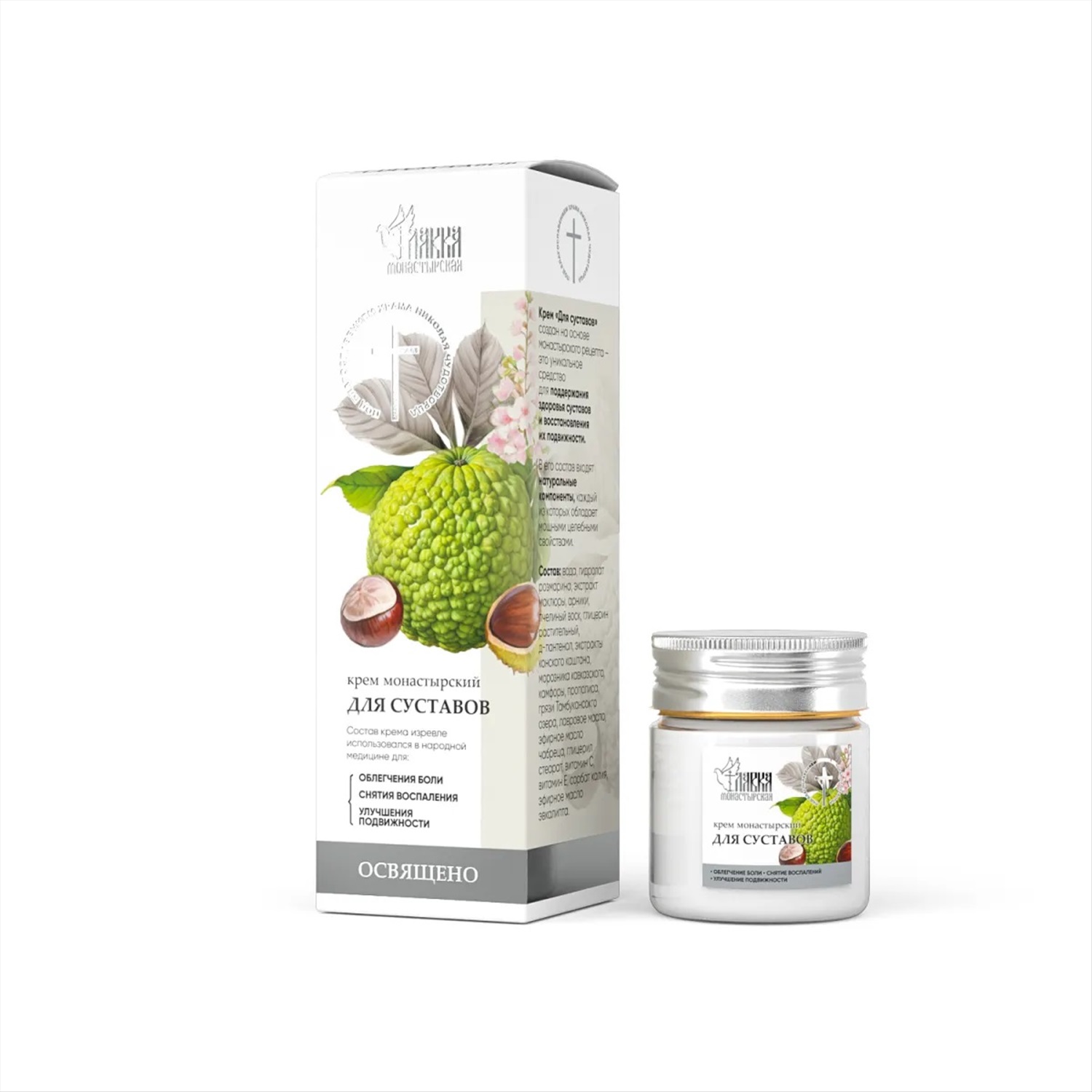 Крем «Для суставов» создан на основе монастырского рецепта – это уникальное средство для поддержания здоровья суставов и восстановления их подвижности. В его состав входят натуральные компоненты, каждый из которых обладает мощными целебными свойствами.