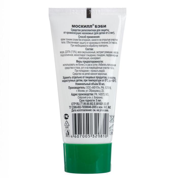 Крем от комаров ""Москилл-БЭБИ"" является детским средством, предназначенным для защиты маленьких детей от укусов насекомых. Продукт поставляется в удобной тубе объемом 50 мл и имеет легкую текстуру, которая быстро впитывается в кожу.