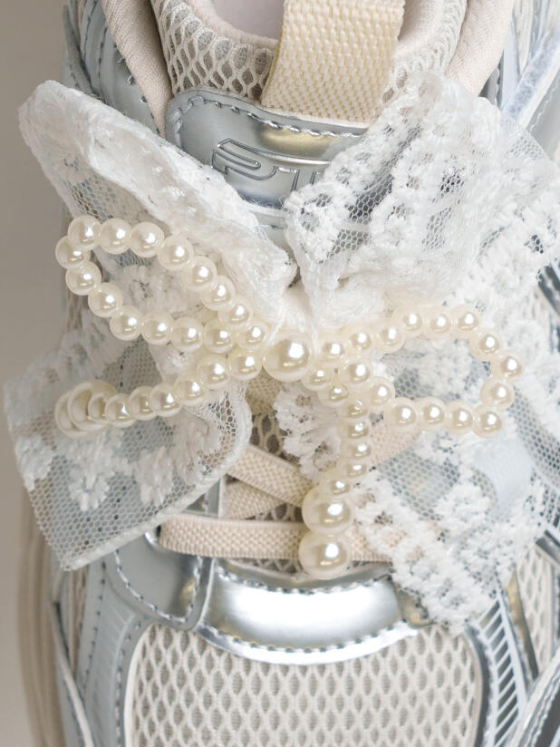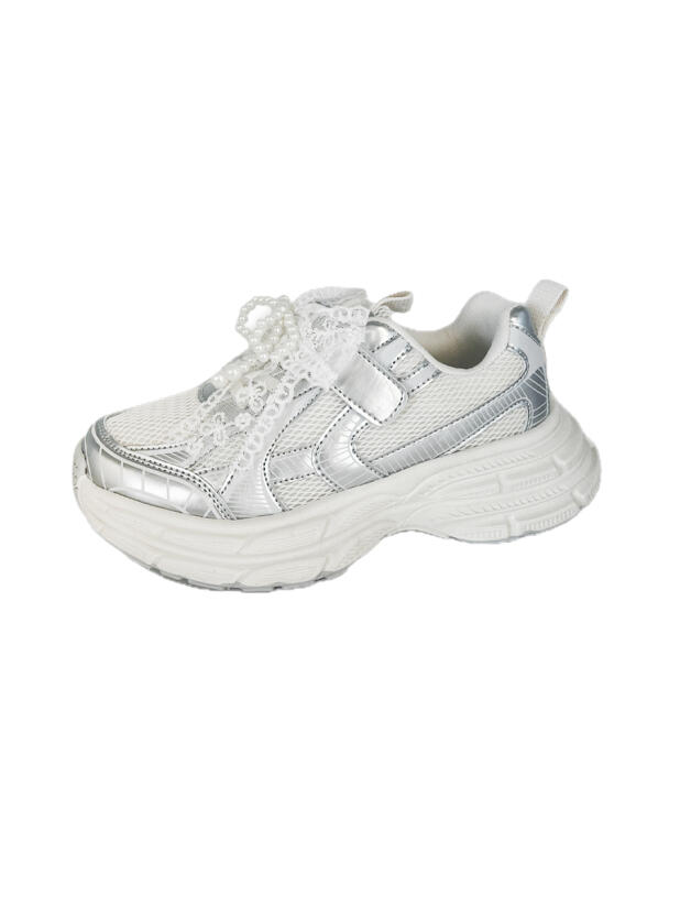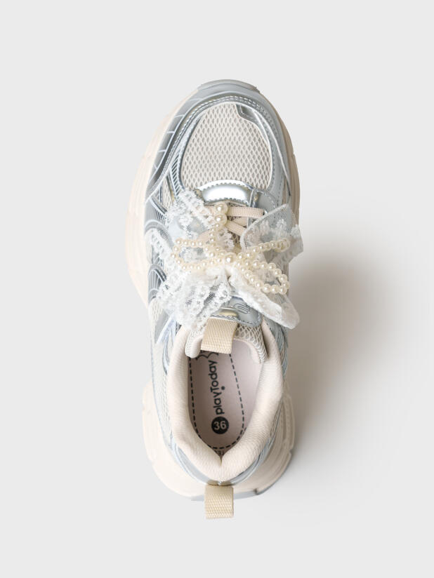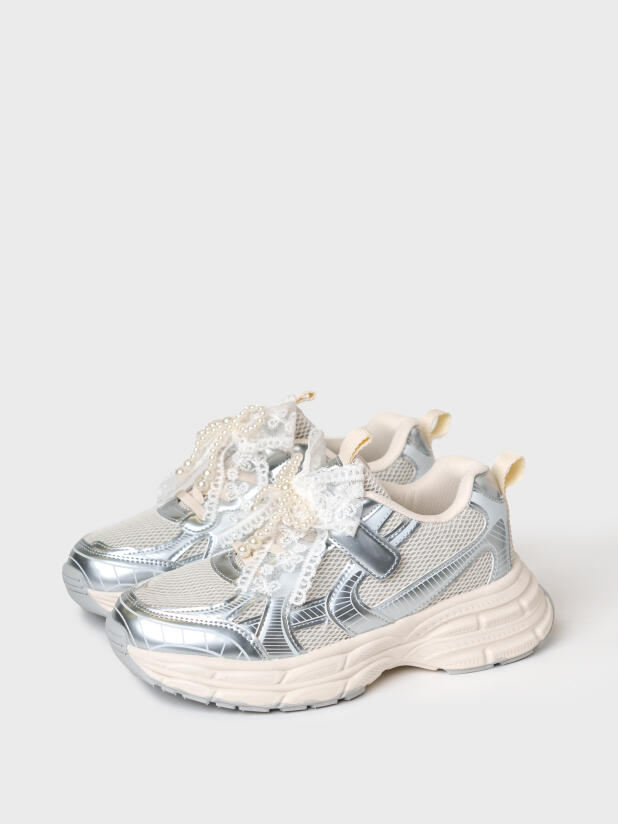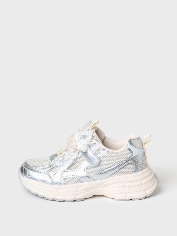 Кроссовки для девочки подростка выполнены из дышащего текстиля и искусственной серебряной кожи, обладающей высокими износостойкими свойствами. Кроссовки имеют резиновые шнурки и липучку. На шнурках имеется трендовый декор из ажурной тесьмы и жемчужных бус. В носочной части обуви стоит текстильная подкладка c высоким содержанием хлопка 80%, которая обладает высокой гигроскопичностью. В пяточной части обуви текстильная подкладка обладает хорошей износостойкостью. Двухсоставная подошва из ЭВА и ТПР легкая и гибкая. Вставки из ТПР в носочной и пяточной частях предотвращают быстрый износ подошвы и делают ее нескользкой. Профилированная стелька из натуральной кожи с анатомической формой подсводника обеспечивает правильную нагрузку на стопу. Формоустойчивый задник поддерживает стопу в правильном положении. Эргономичная форма колодки обеспечивает правильное формирование стопы ребенка.