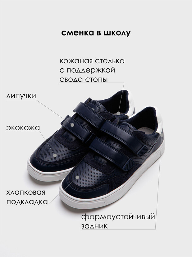 Анатомическая стелька из натуральной кожи помогает правильно распределить нагрузку на стопу, поддерживает здоровье ног и делает эту удобную школьную обувь комфортной даже при длительной носке. Усиленный задник фиксирует пятку, а липучки позволяют подстроить обувь под индивидуальный подъём.