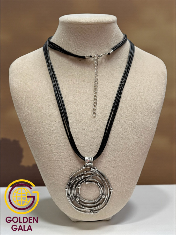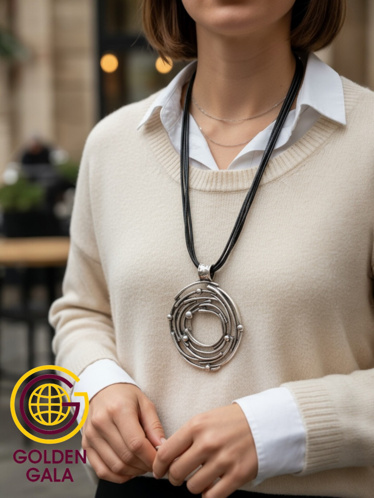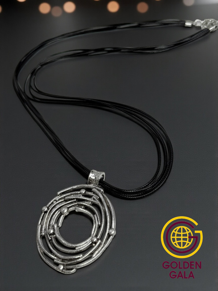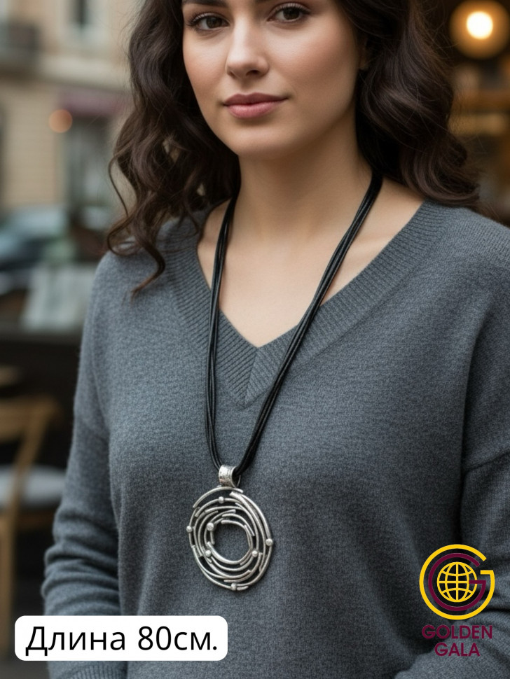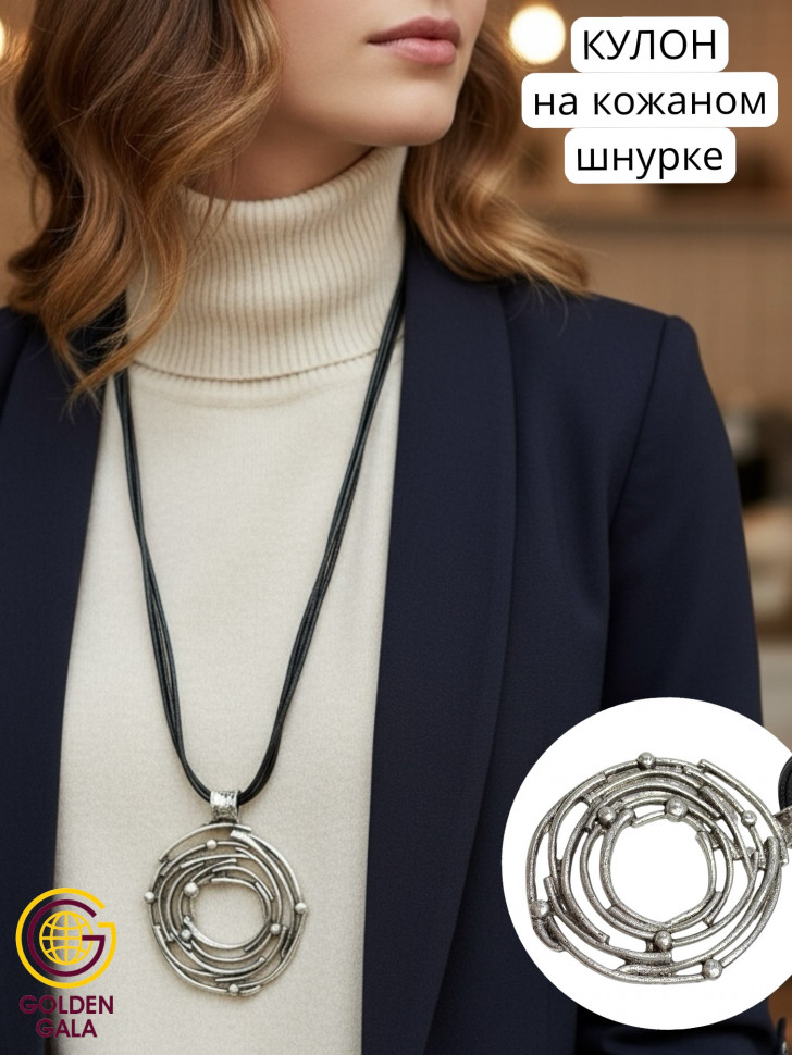 Созданная с любовью к искусству, эта длинная подвеска на кожаном шнурке сочетает в себе гармонию природных текстур и благородных металлов. Многослойный кожаный шнур придает изделию особую глубину и мягкость, а металлические элементы кулона, переливающиеся в лучах света, делают его по-настоящему универсальным – идеальным как для повседневных луков, так и для вечерних выходов.
