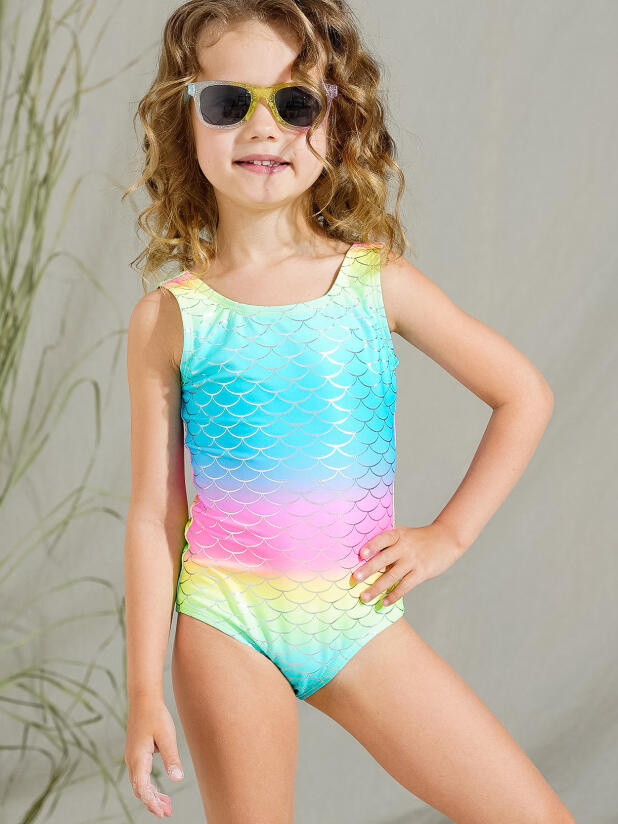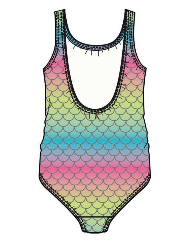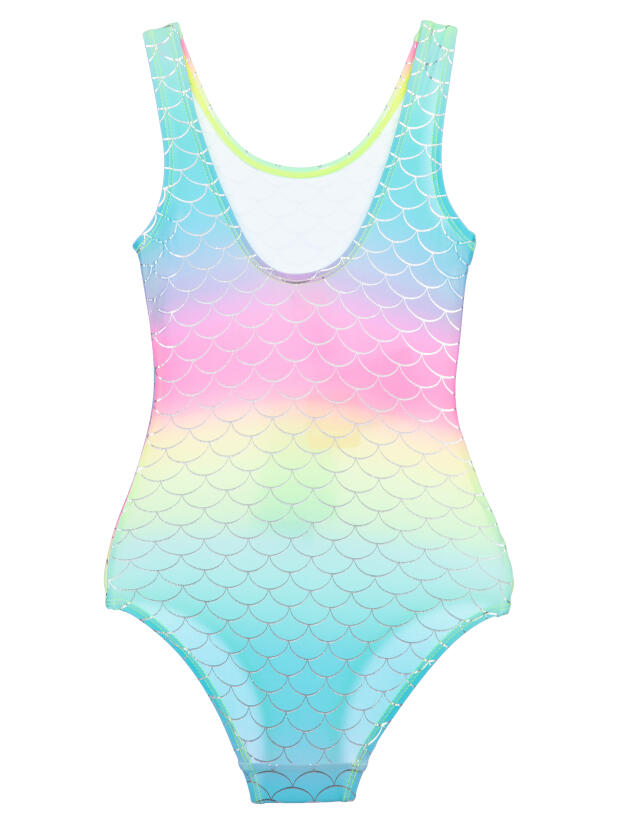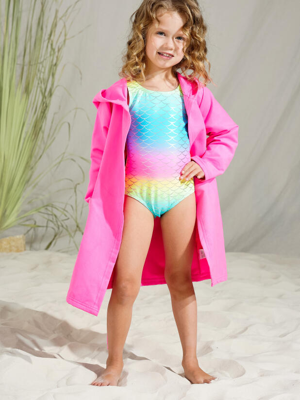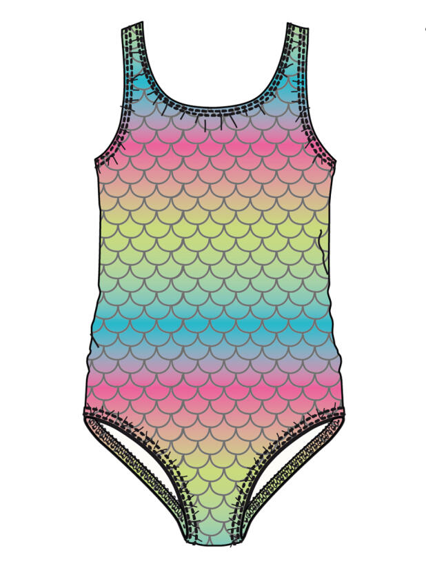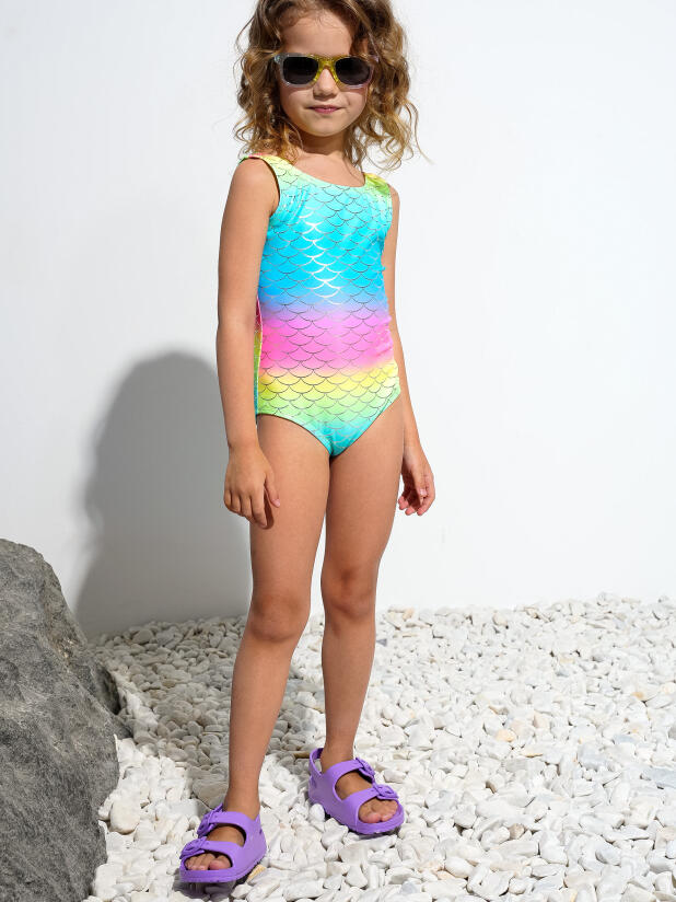 Быстро сохнет и сохраняет первоначальный вид и форму даже при длительном использовании. Устойчивая к выгоранию ткань. Серебряное тиснение в виде чешуи. Подходит для плавания в бассейне.