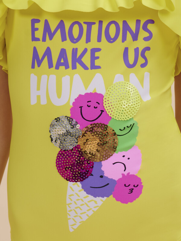 Яркий и модный слитный купальник для девочки. Модель с горизонтальным вырезом горловины подходит для девочек с любым типом фигуры. Тонкие и мягкие бретели не сползают, исключают трение и раздражение. На спинке бретели перекрещиваются, предусмотрена возможность регулировки длины. Детский купальник выполнен из полиамида и эластана — он прекрасно тянется, не теряя при этом своей формы, не выгорает и быстро сохнет. По верхней линии изделие украшено декоративным рюшем. По переду модель декорирована ярким позитивным принтом с пайетками в виде большого разноцветного мороженого, надпись переводится:"эмоции делают нас людьми". Принт эластичный и стойкий, отлично переносит многочисленные стирки. Модель представлена в двух трендовых неоновых цветах: розовый и зелёный. В линейке есть детские купальники следующих размеров: 3 (98); 4-5 (104-110); 6-7 (116-122); 8-9 (128-134); 10-11 (140-146). Купальник красивый подходит для девочек дошкольного, младшего школьного возраста и девочек-подростков. Отличный вариант для летнего отдыха, пляжа, моря и бассейна. Модный купальник — чудесный подарок дочери, внучке или сестре на любой праздник. Выбирайте нужный размер по таблице размеров на фото. Цвет товара на экране вашего устройства может отличаться от цвета изделия вживую. Товар возврату и обмену не подлежит.